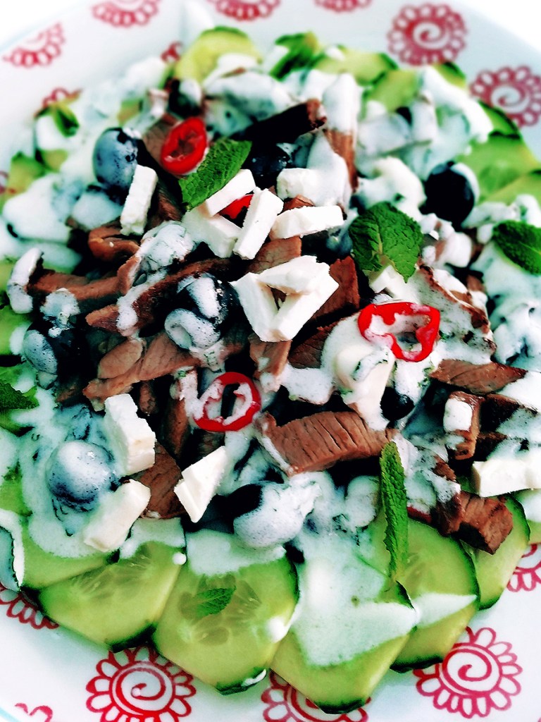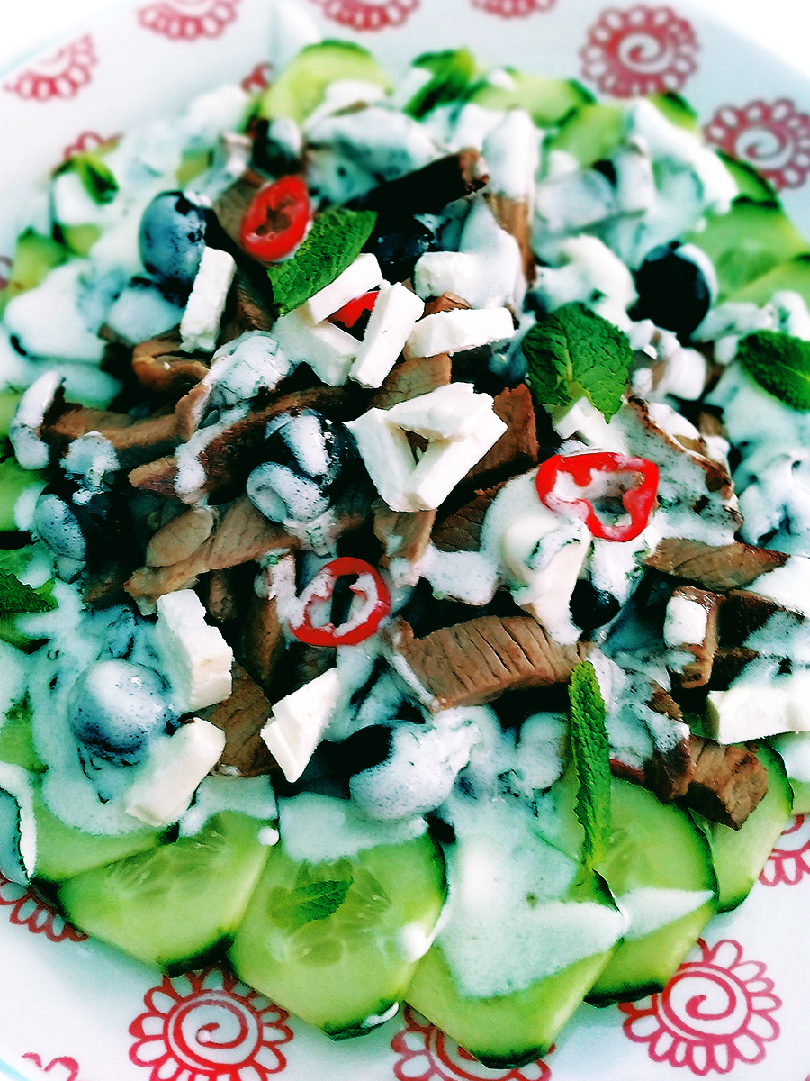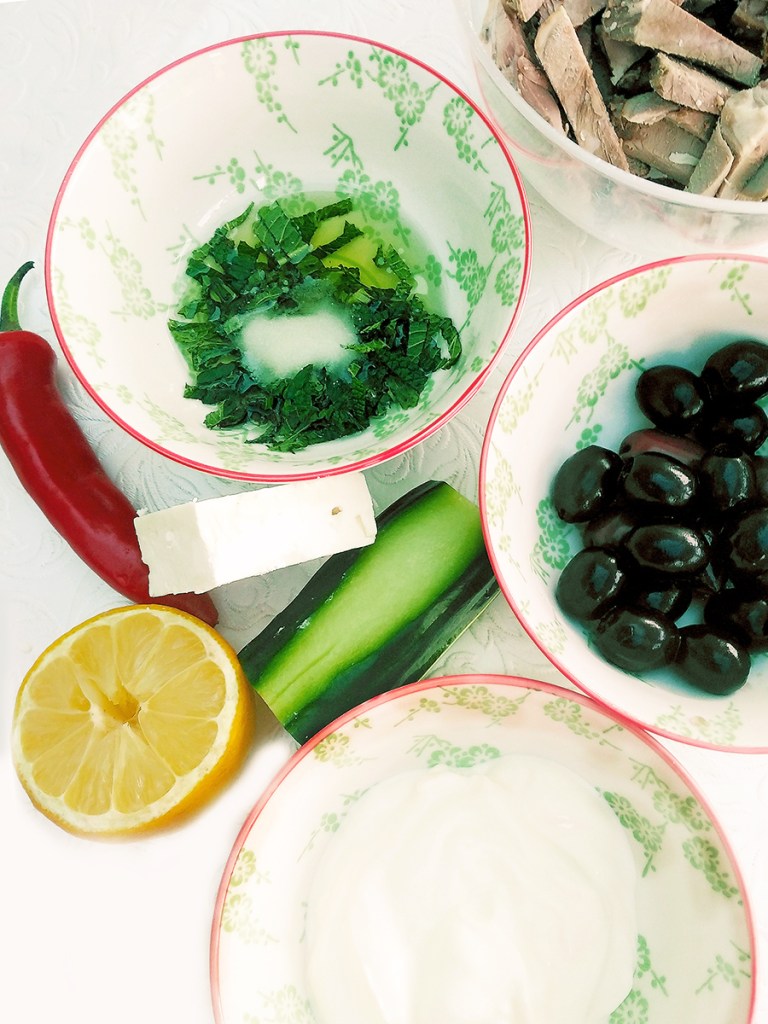 - Slice the lamb into similar sized strips and finely dice the chilli into rounds. Cut the cucumber into slices and arrange on a serving platter. Finely chop the mint, leaving a few leaves whole to add to the platter at the end. Mix together the olive oil, salt, yoghurt and mint then squeeze over the juice of the lemon and stir to make a dressing.