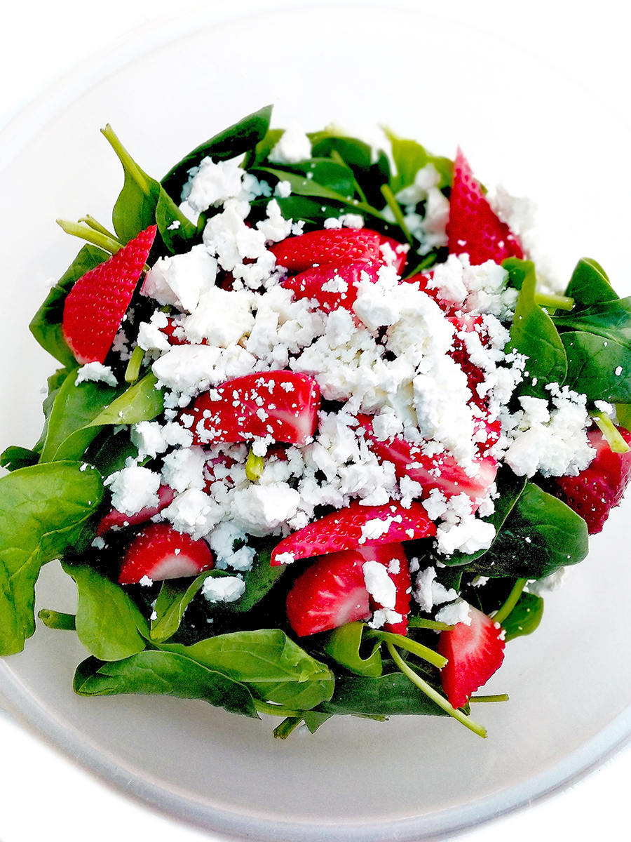- Make the dressing by putting the olive oil, balsamic vinegar, Dijon mustard, honey, salt, pepper and finely chopped garlic into a jar and shake very vigorously to combine. Cut the strawberries into rounds, discarding the tops. Tip the spinach into a large bowl then add the strawberries. Do not add the dressing yet.
