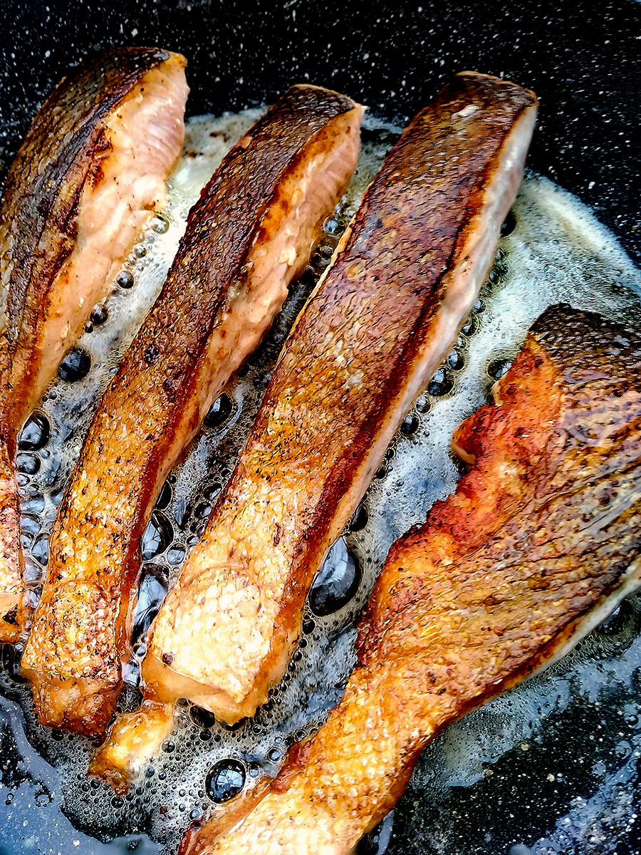 - If you want crispy salmon skin use a very sharp knife to scrape the scales off then wipe down the fillets with kitchen towel. Grind salt over the salmon skin. Put the butter and 1 tbsp olive oil into a large skillet on a medium high heat. Once the fat is hot put the fillets in, skin down, and press down on the fillets then do not move them for 5 minutes.