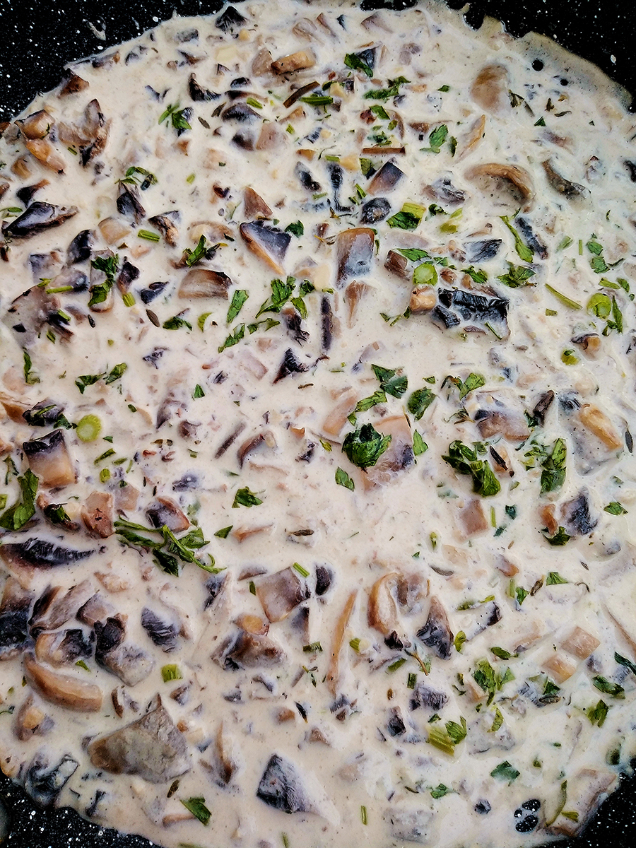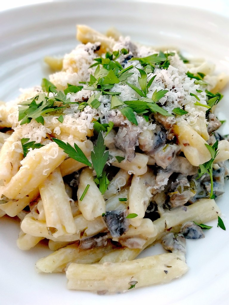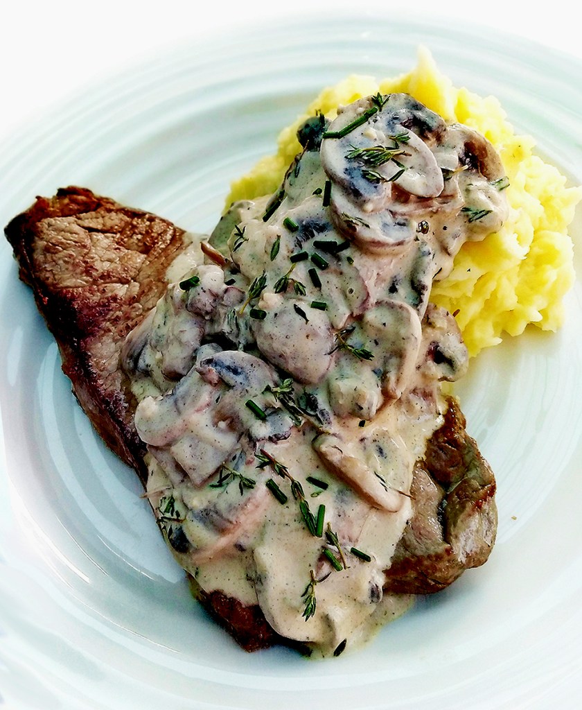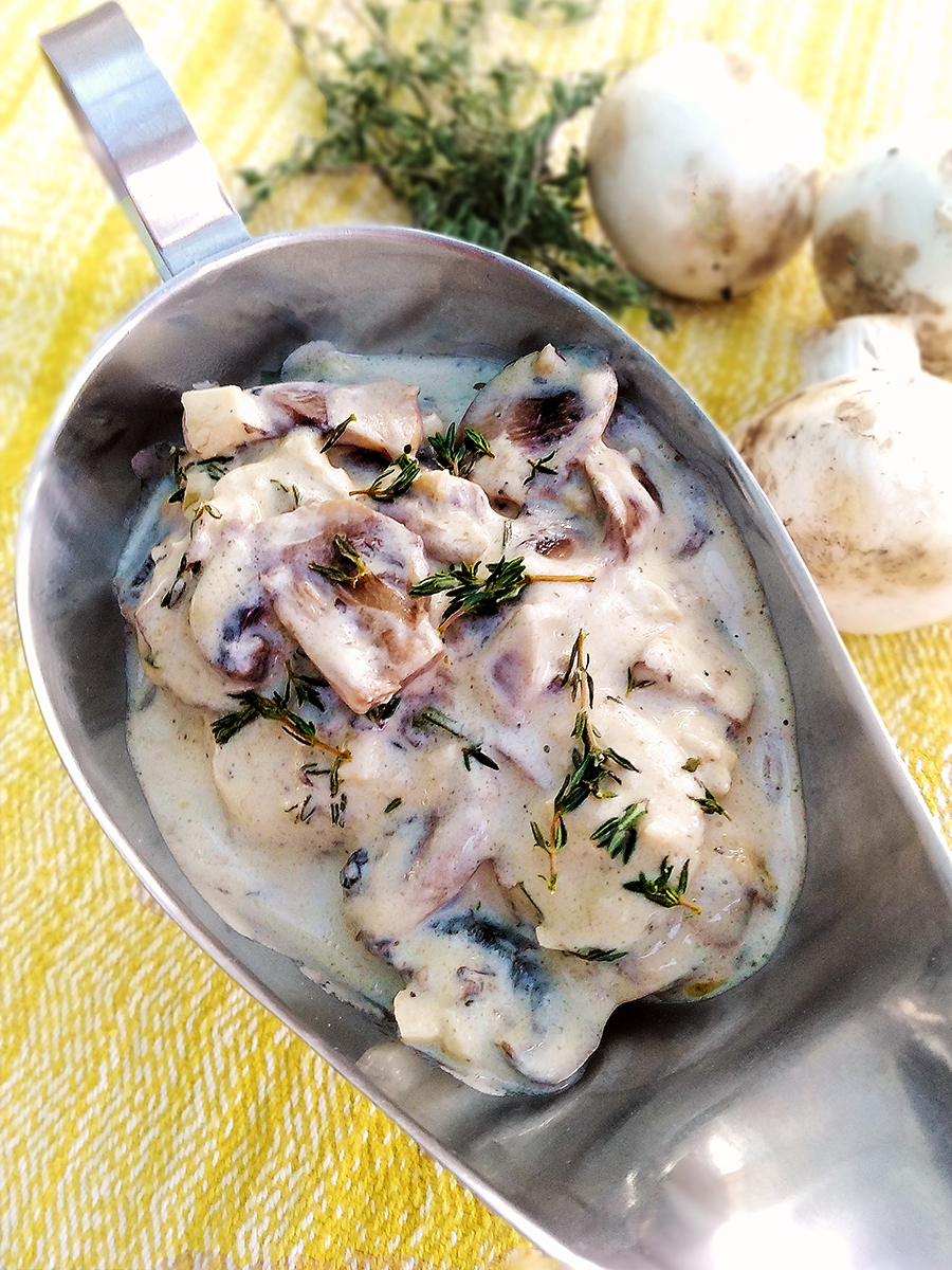 This is my Ultimate Mushroom Sauce because it can be used in lots of different ways. As I’m the only mushroom eater in our house I make a batch of sauce for myself then use it in a couple of ways during the week. How you chop the mushrooms changes the texture of the sauce. I like the sauce with big slices of mushroom finished with thyme to go with a medium rare steak and small chopped mushrooms finished with parsley to stir into pasta or served with 4/20 chicken breasts. *Cooking Tip: When you use cream in a dish make sure you have an acid as well to balance it out; this dish has a tablespoon of white wine vinegar that brightens and balances the whole dish.