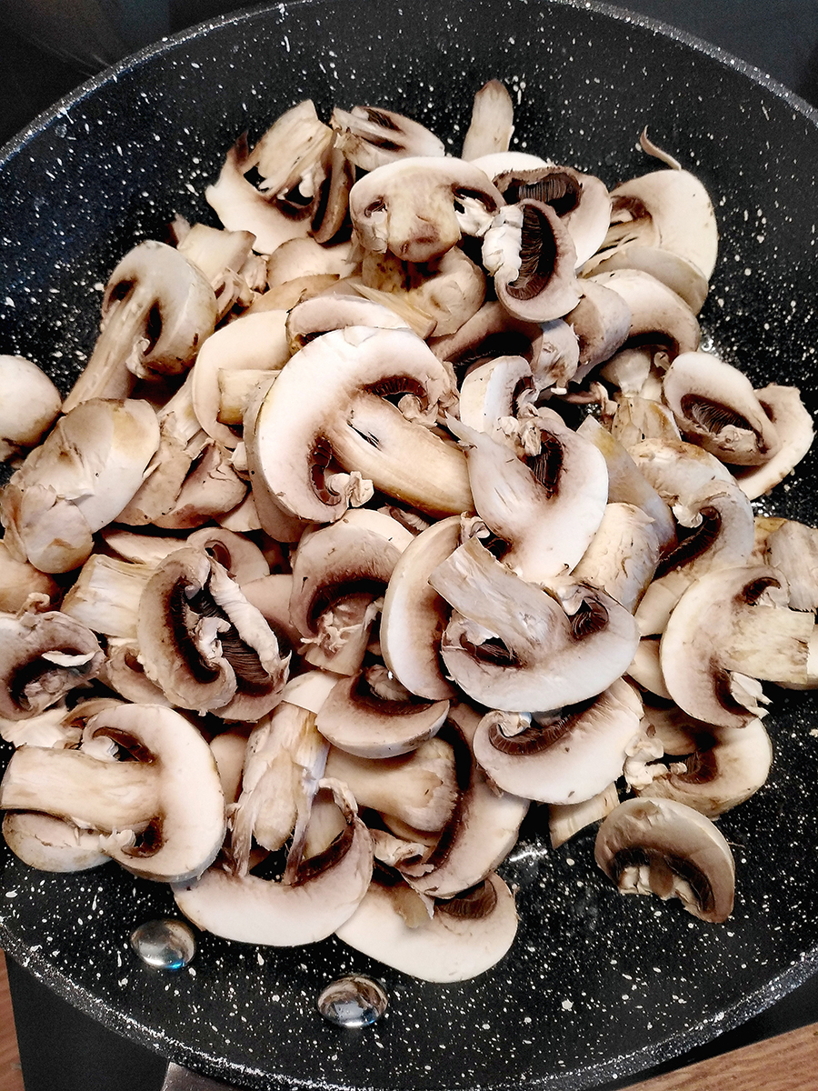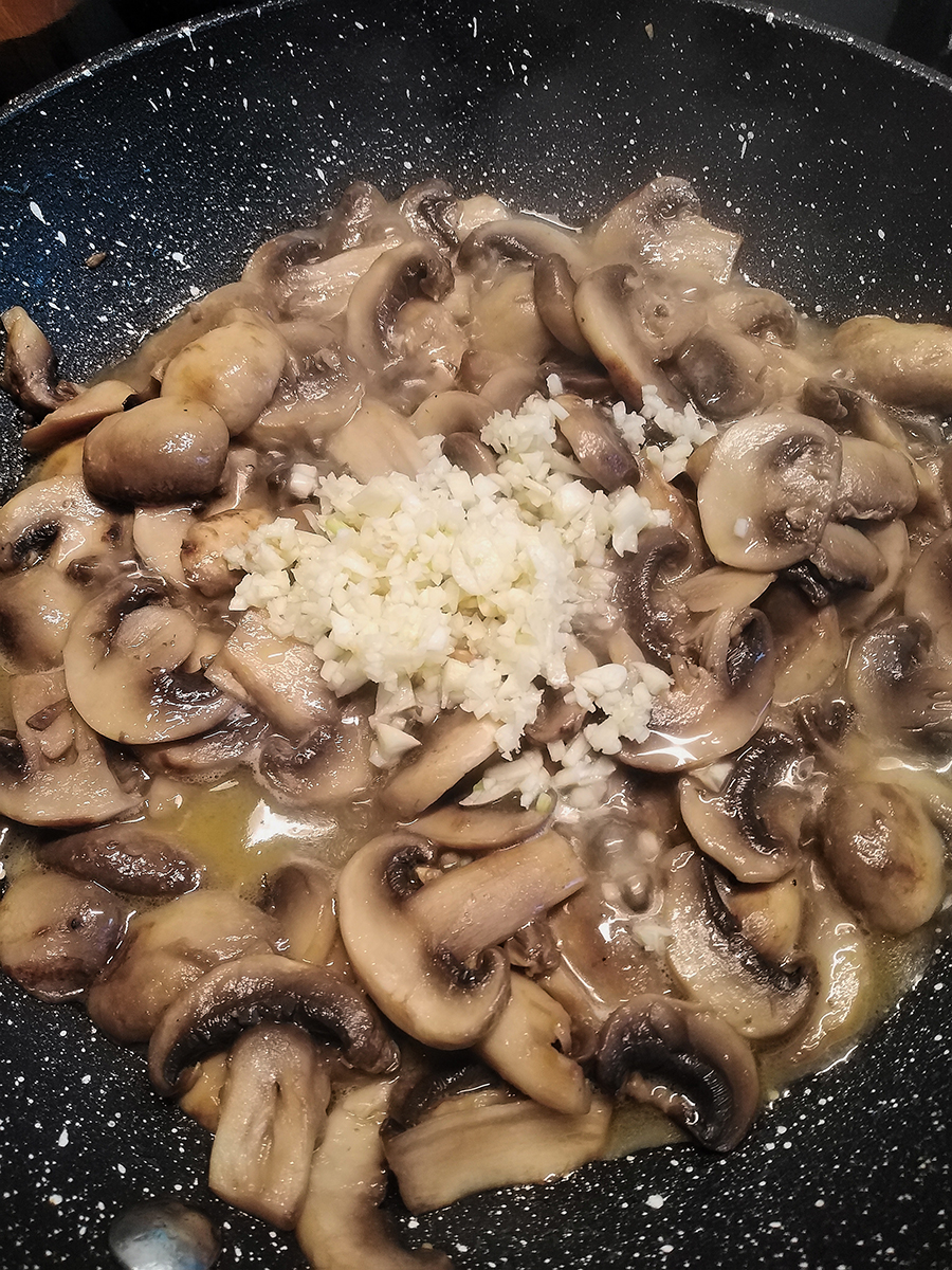 - Chop the mushrooms into whatever size you want then finely chop the garlic. Put the butter into a large frying pan on a medium high heat and add the mushrooms and grind over with salt then cook, whilst stirring occasionally to stop them burning, until they are browned. Add the garlic and cook for 1 minute then add the vinegar and cook for 30 seconds before pouring in the stock.