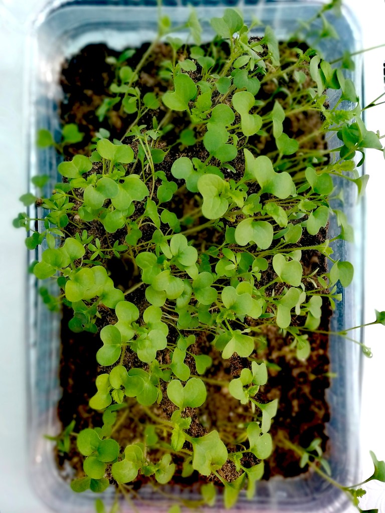 After a couple of weeks you’ll have tender micro greens. Cut them about a centimeter from the base to harvest. Sprinkle over a few more seeds and you’ll get new shoots popping up to replace the ones you’ve already harvested.