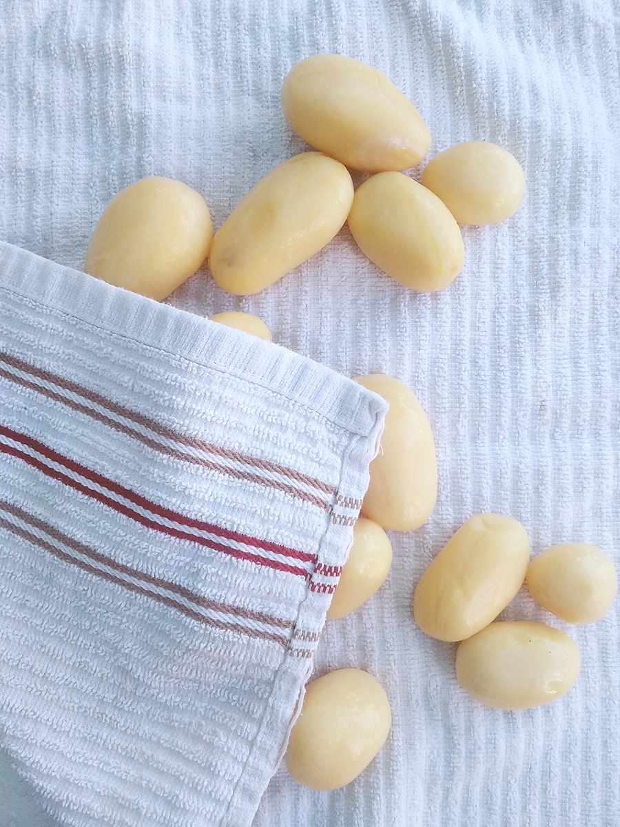 I use this recipe when I don’t have the time or inclination to make roast potatoes but still want to eat crunchy, salty potatoes. Tinned potatoes are inexpensive and they’re already peeled and salted so you just have to add some crunch. Make sure you dry the potatoes as much as possible before cooking because this will ensure they get crunchy. The leftover potatoes are amazing fried the next morning for breakfast.