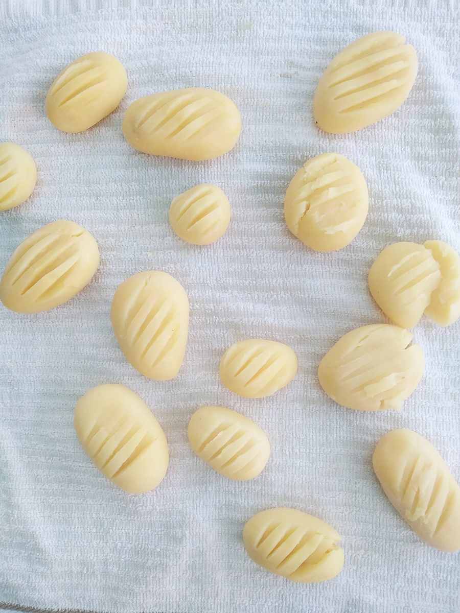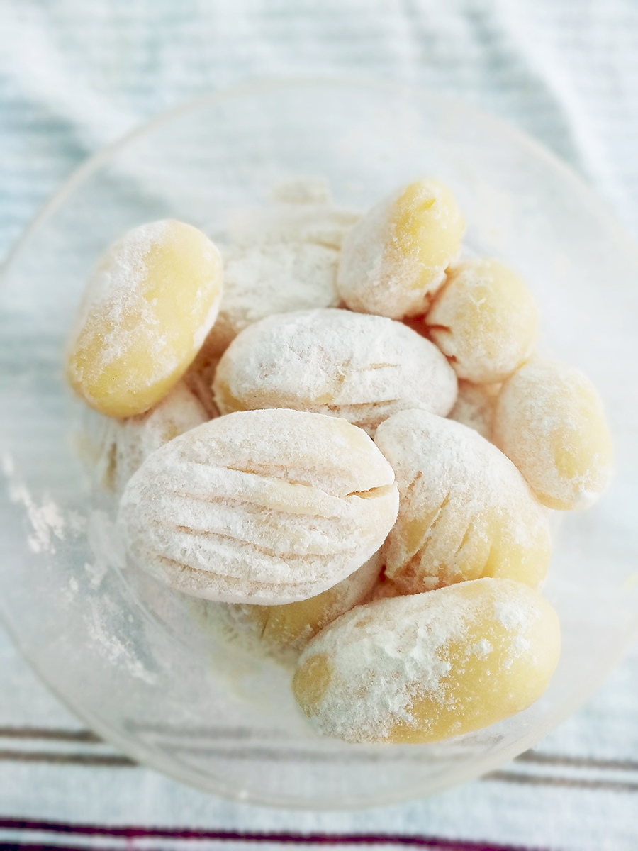 - Preheat the oven to 220°C (200°C fan). Drain the potatoes and dry them on a clean tea towel then gently press a flat fork on the top of each spud, this will add more crunch. Either in a large bowl or on the tea towel, sprinkle the potatoes with flour until they’re all coated.