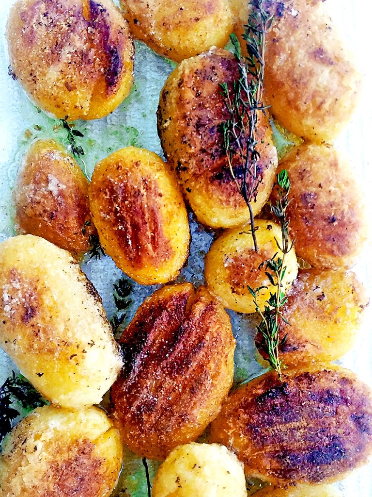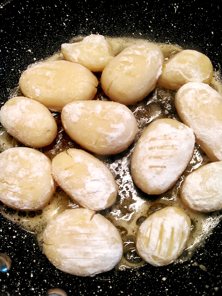 - Melt 35g of the butter and oil in a large frying pan on a medium high heat then brown the spuds on both sides (about 3-5 minutes each side). Transfer the potatoes to an oven-proof dish. Cut the rest of the butter into small pieces and add to the dish along with the herbs and roast for 10-15 minutes until golden. Sprinkle over some sea salt, add some fresh rosemary or thyme to serve.