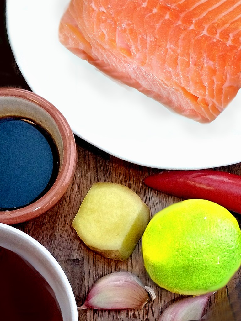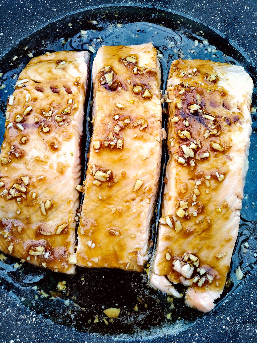 - Pre-heat the oven to 195°C (175° Fan). Peel and finely chop the garlic and ginger. Season the top of the salmon fillets with salt then place them skin side down in an ovenproof dish.