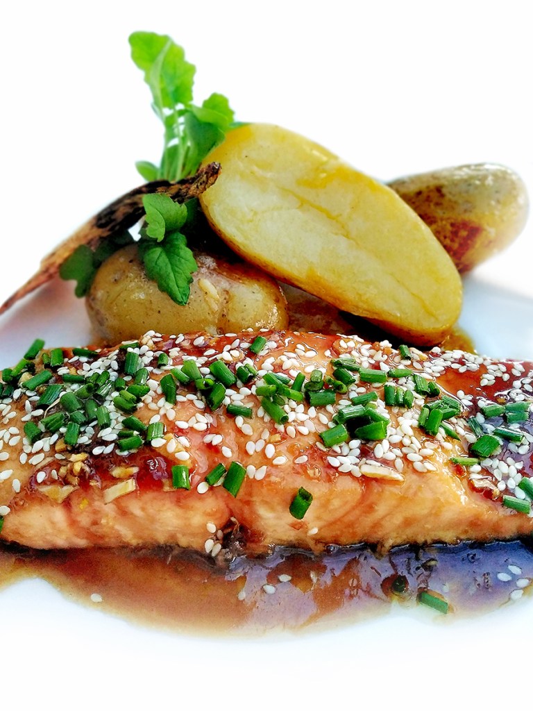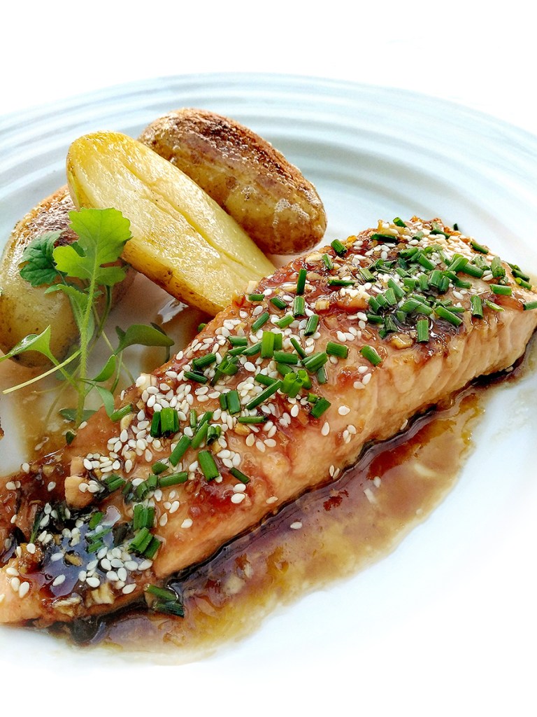 - In a medium skillet over a medium heat put the garlic, ginger, soy sauce, and maple syrup (along with chilli if using) and heat until bubbling gently then pour over the salmon fillets making sure to coat all the sides. Put into the oven for 7 minutes then squeeze over with a little lemon juice and sprinkle with sesame seeds and chopped chives. Serve with new potatoes and salad.