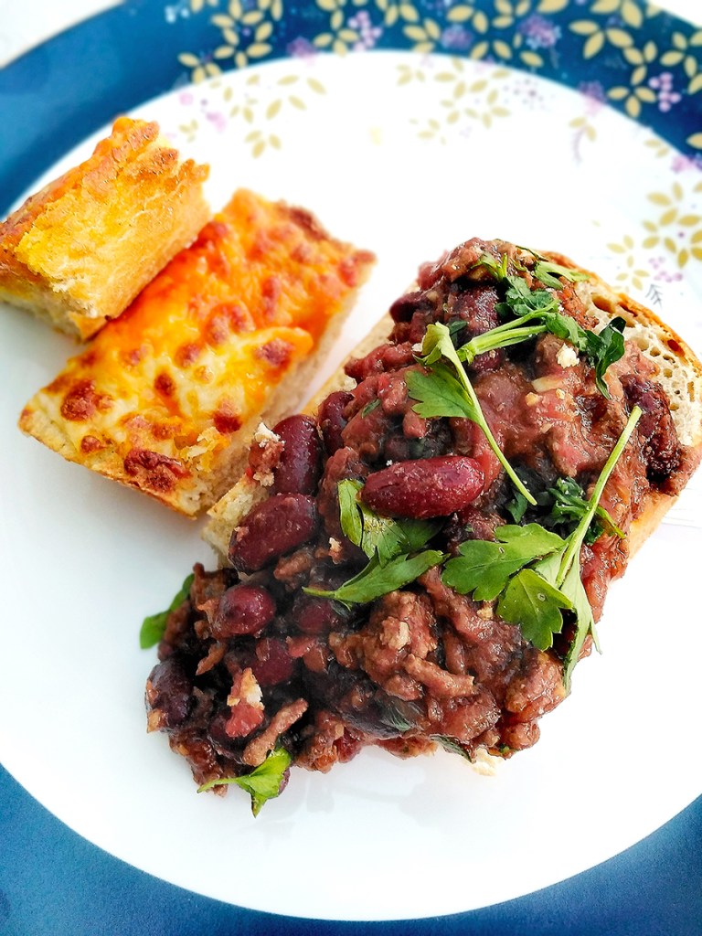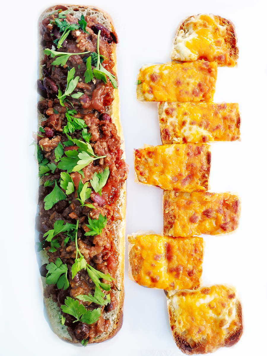 - Spoon the warmed chilli into the cut out half of the bread and sprinkle over with chopped parsley if you like it. Once the cheesy half is ready cut it into sections then serve alongside the chilli boat which you can slice and serve at the table. Provide extra grated cheese and sour cream at the table.