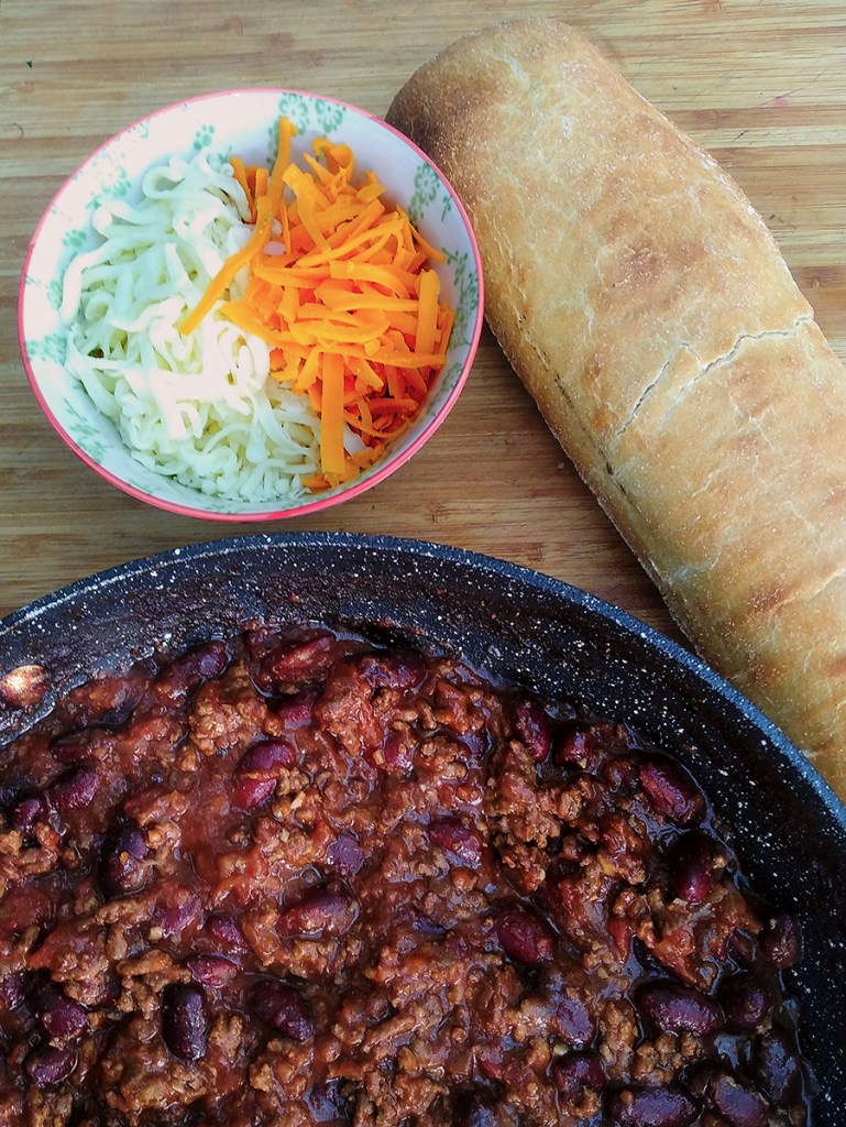 Today is the first day of National Sandwich Week so I’m kicking off with a part sandwich/part leftovers meal. When I make my Kid-Friendly Chilli Con Carne Recipe I use the leftovers to make this chilli boat and the kids feel like they’ve had totally different meals. If you can bake your own bread then I take my hat off to you, but if you’re a baking idiot, like me, then the bake at home loaves are ideal or you can buy a fresh, ready-baked loaf. This is such an easy meal to put together makes leftovers great fun.