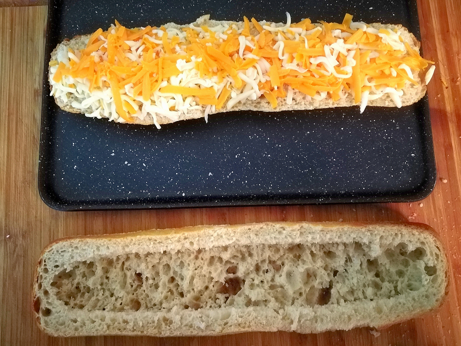 - Put the thinner top part of the bread on a baking sheet then sprinkle over with cheese and pop it under the grill until the cheese has melted.