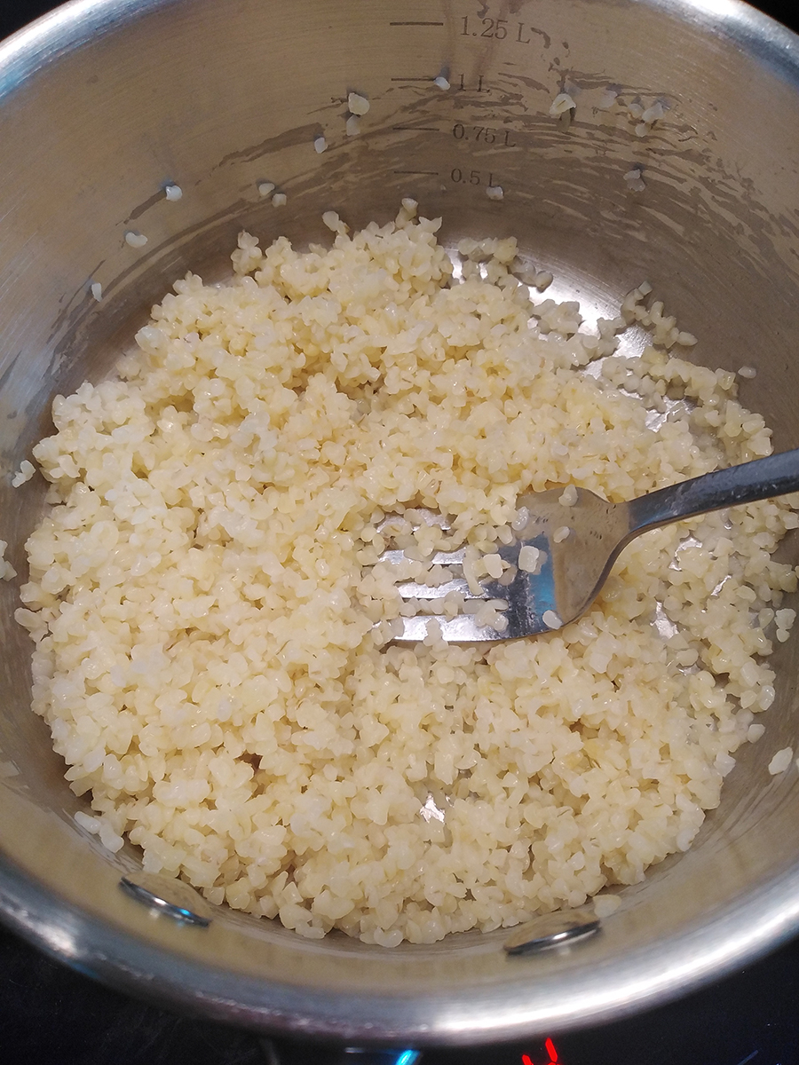 - Put the bulgur wheat in a small saucepan that has a lid then cover with 120ml of water and grind over with salt. Bring the water to the boil then immediately turn the heat down to low, put the lid on and set a timer for 20 minutes. Once the bulgur wheat is cooked fluff the grains with a fork and leave until the salad is ready.