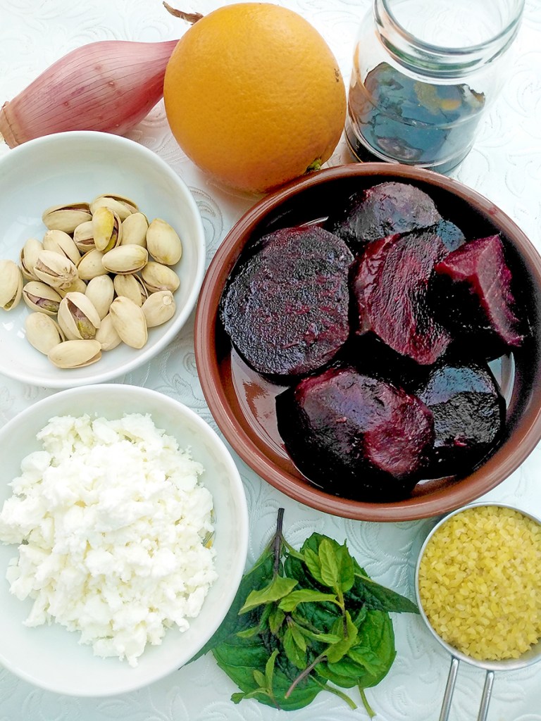 - Cut the beetroot into cubes, shell and chop the pistachios, segment and chop the orange then finely chop the mint and put into a mixing bowl along with the crumbled feta. Squeeze the juice out of the remaining orange membrane into the balsamic dressing jar and give it a good shake.
