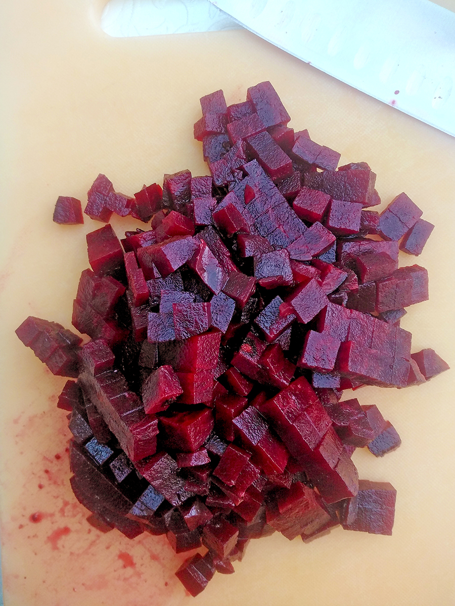 You can buy pre-cooked beetroots but if you want to cook your own then steaming them gives a lovely result. If you don’t have a steamer get a large saucepan or Dutch oven (the pan needs a lid) then place a small colander upside down in the pan. Pour water into the pan until it reaches just below the top of the colander. Scrub the beetroots clean then trim off the root and all but 2cm of the stalk then place on top of the colander, place the lid on and cook on a medium high heat until you can easily piece the beetroot with a sharp knife. Leave the beetroots in the pan with the lid on to cool for 30 minutes then the skins will easily peel away leaving you with a tender, cooked beetroot.