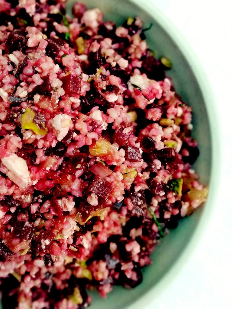 Ever since I was little I have had a deep love of beetroot and this salad reminds me of the tiny cubed beetroot salad I ate in primary school. I think that salad was served with spam but I serve mine with grilled meats, fish or warmed cheese and fruit. Salads are an easy way to get whole grains into your diet and the bulgur wheat in this salad does all sorts of lovely things for your heart, digestion and blood sugar levels. It keeps very happily in the fridge for a few days so the leftovers are great for lunch.