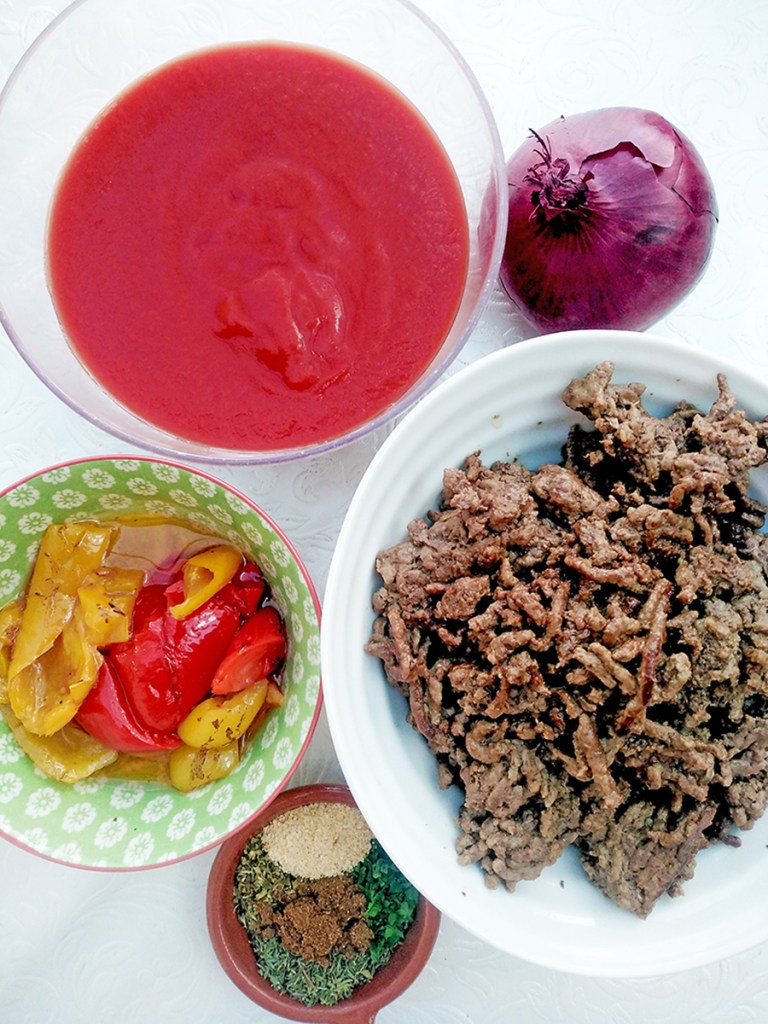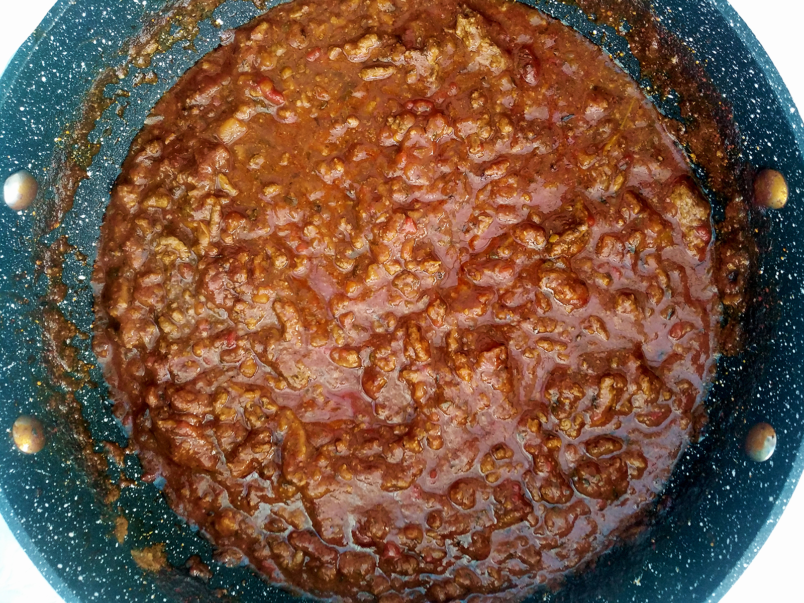 • Brown the ground beef in a little olive oil on a high heat in a large pan; grind over some salt. Don’t move the meat until it is brown then turn and cook for another 3 minutes. Remove the cooked meat using a slotted spoon to a dish.