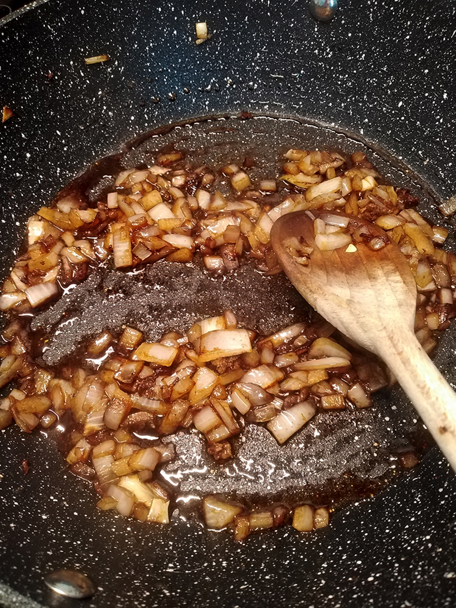 • Get your water going for the pasta. Peel and chop the onion then add to the pan and cook on a medium/high heat for 8-12 minutes until they’re soft. Grind some salt over the onions.