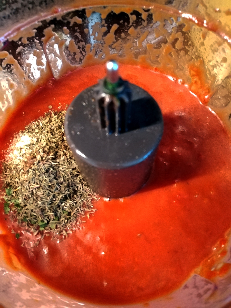 • Tip the cooked onions into a food processor along with the passata, jarred peppers, garlic powder, oregano, thyme, parsley and mixed spice then blitz until smooth. Put your pasta into the salted, boiling water to cook.