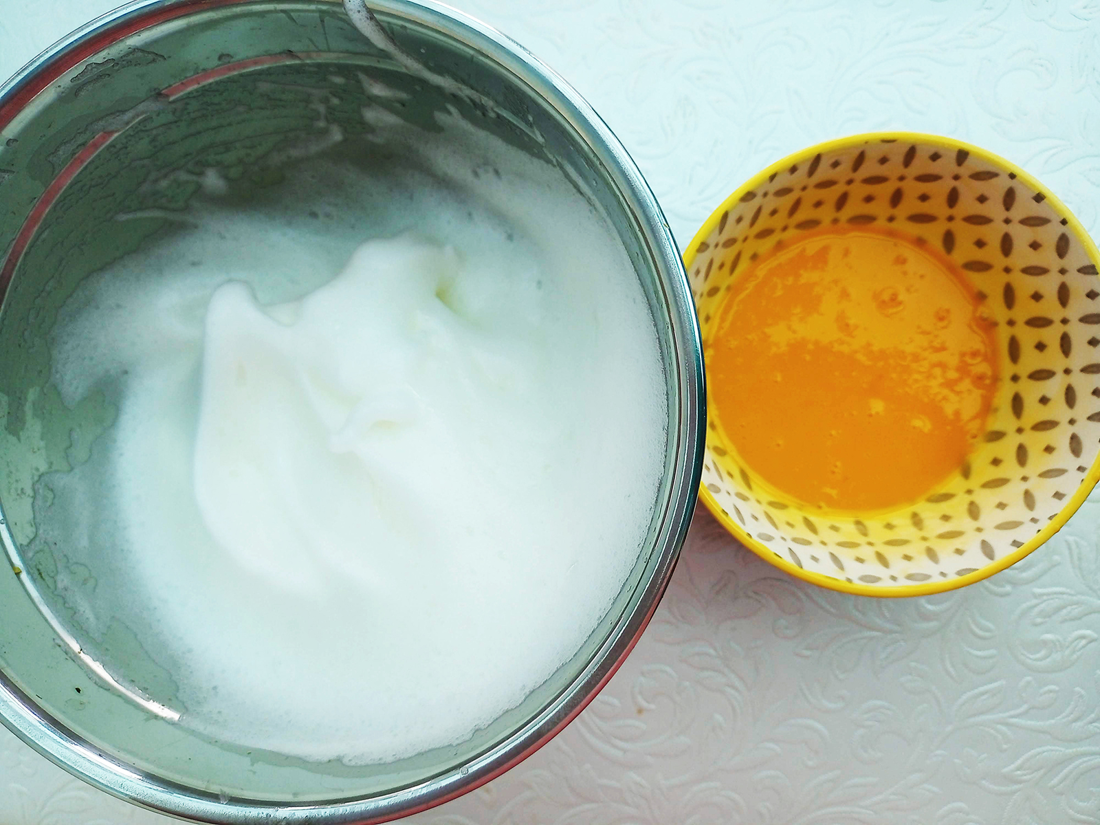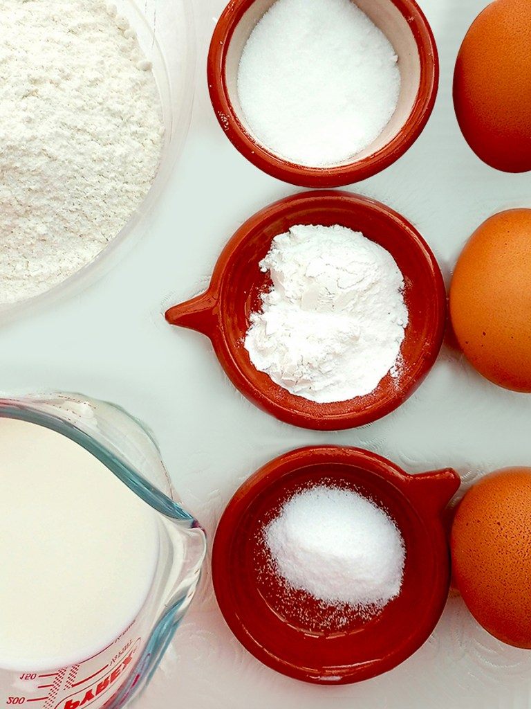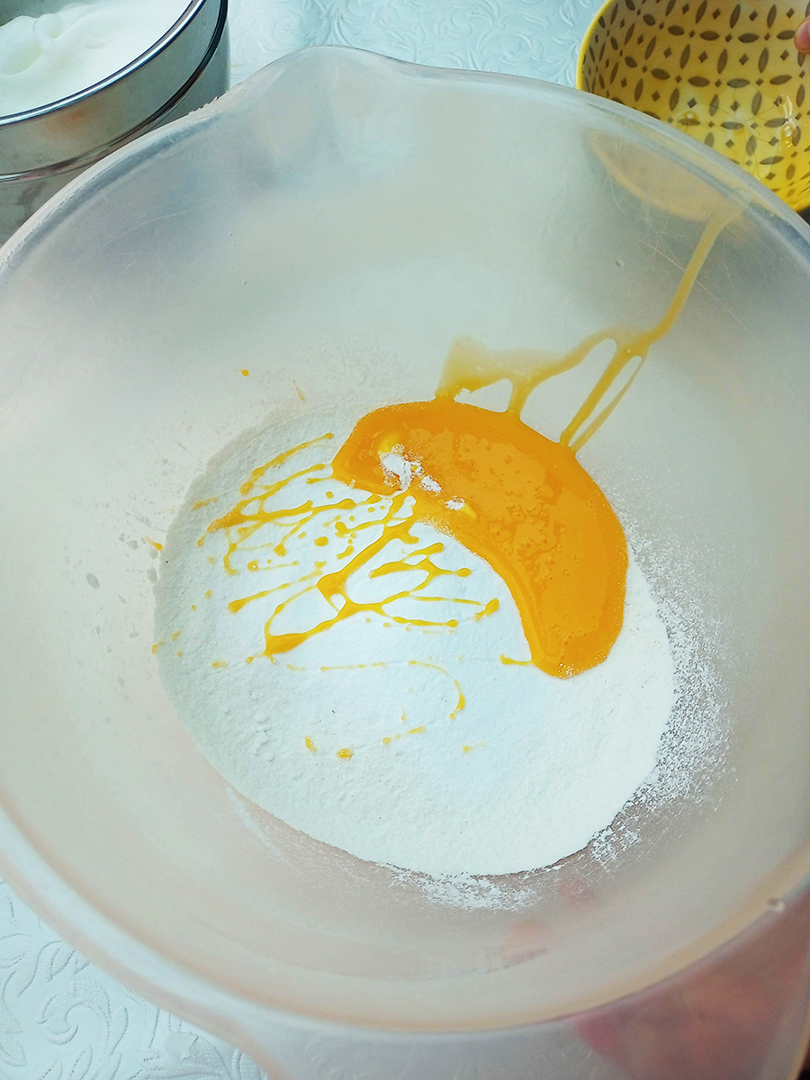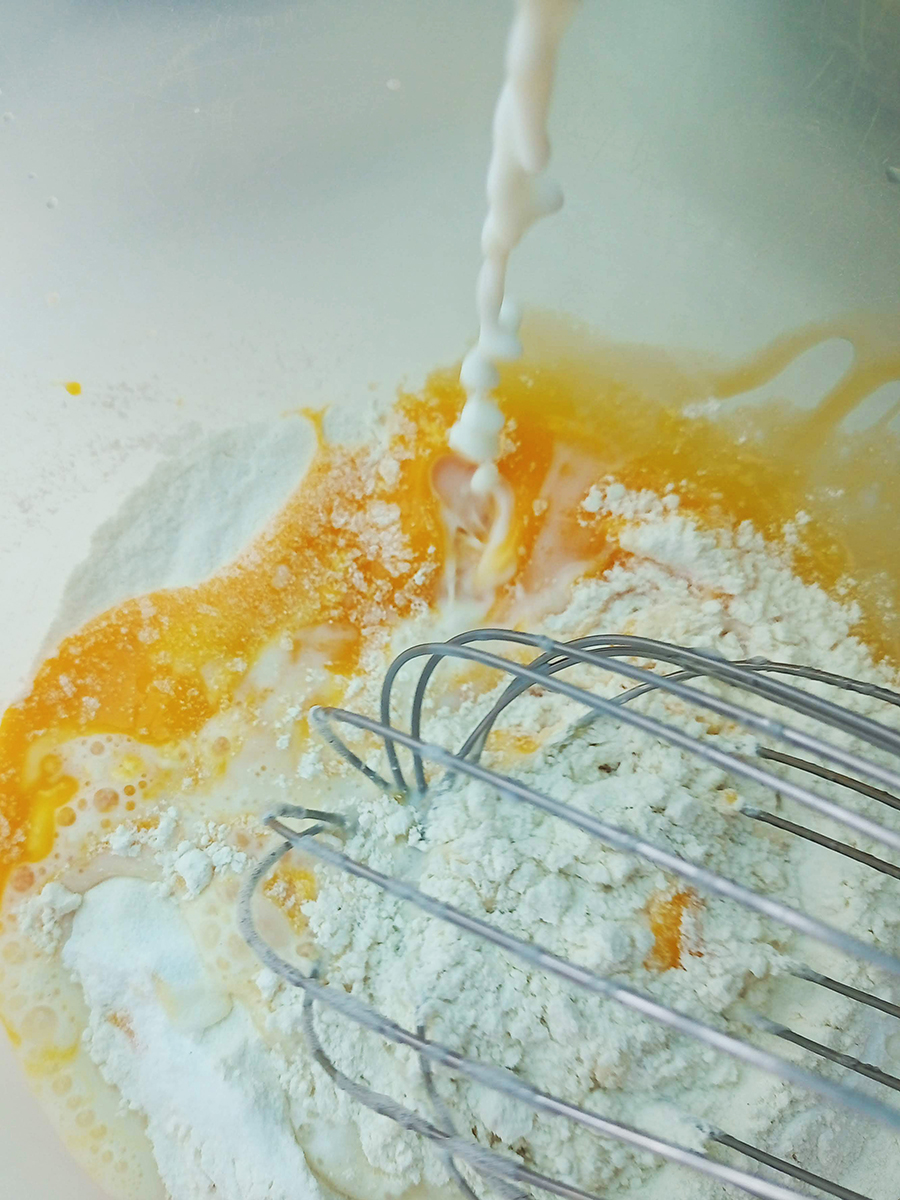 • Sift the flour, salt, baking powder and sugar into a mixing bowl. Separate the yolks and whites of the 3 eggs then whip the whites until foamed. Whisk the egg yolks and add them to the flour then whisk while gradually adding the milk.