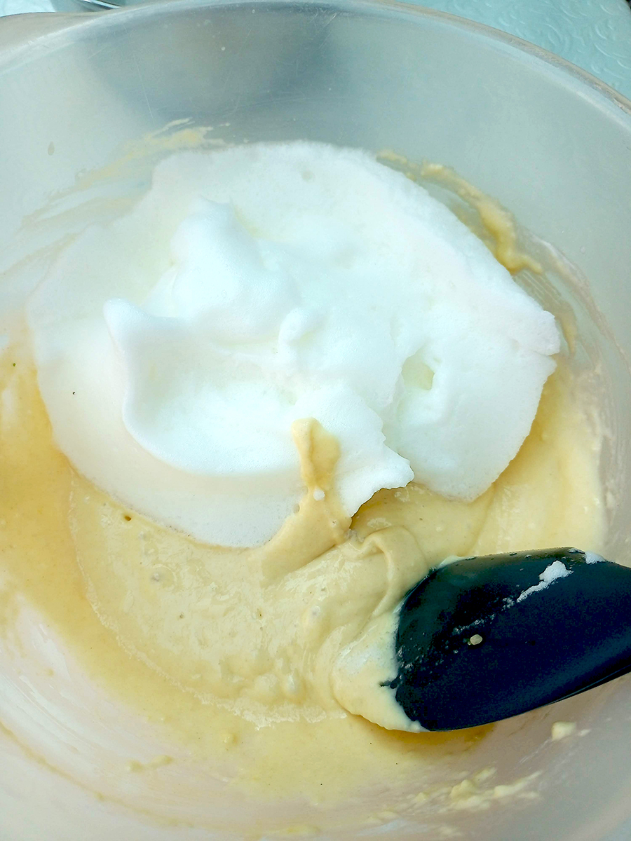 • Tip the whipped egg whites into the mixture and fold in using a spatula. (If you’ve seen Schitt’s Creek then I’ll save you the time and say folding is mixing in a vertical circular motion rather than stirring which is a horizontal circular motion. This keeps air going into the mixture.)