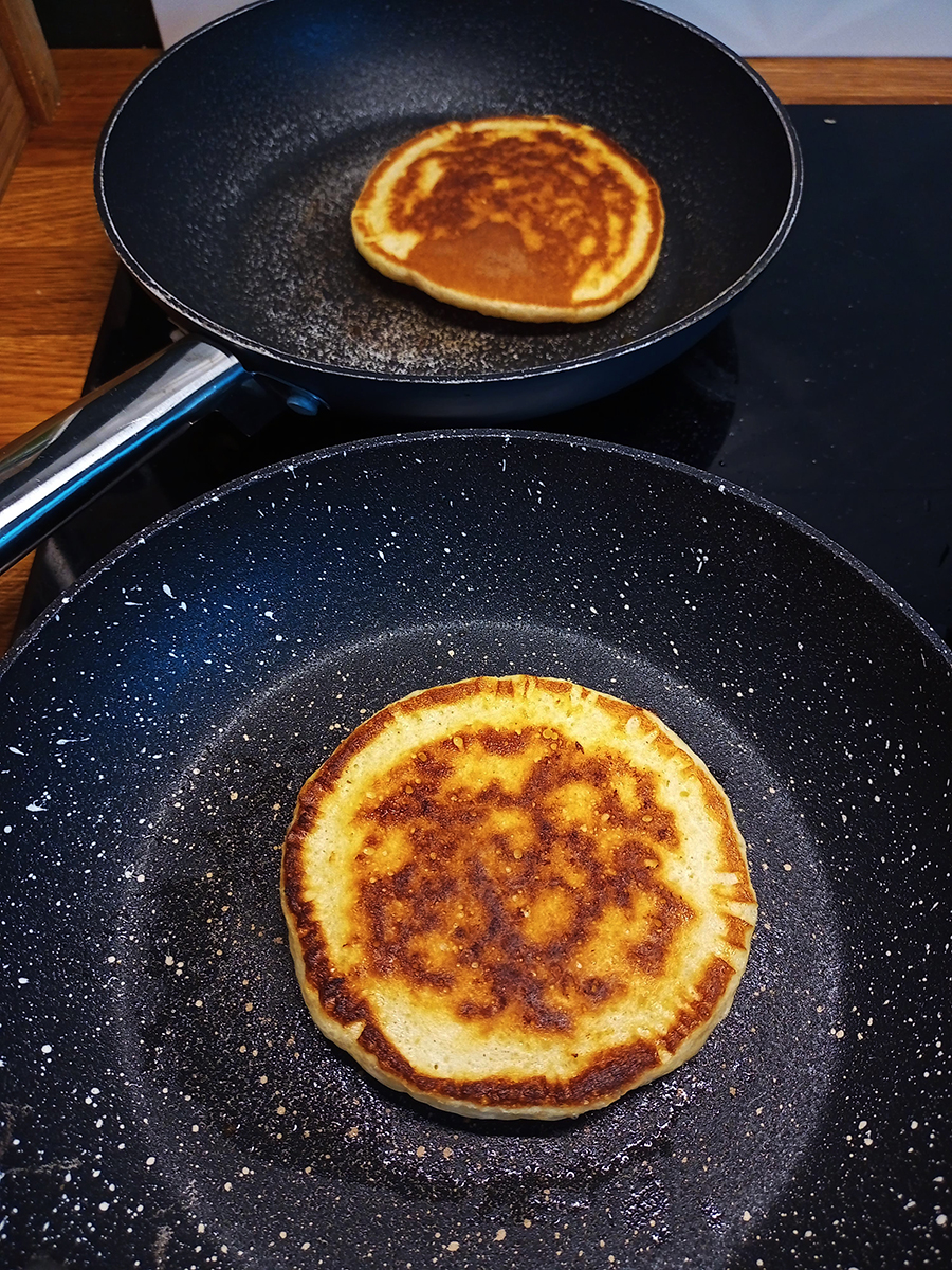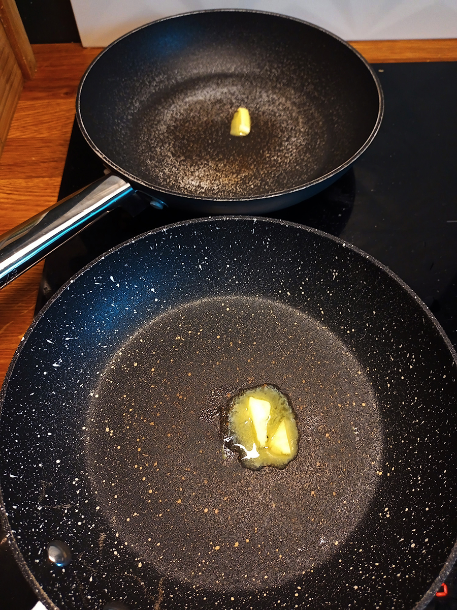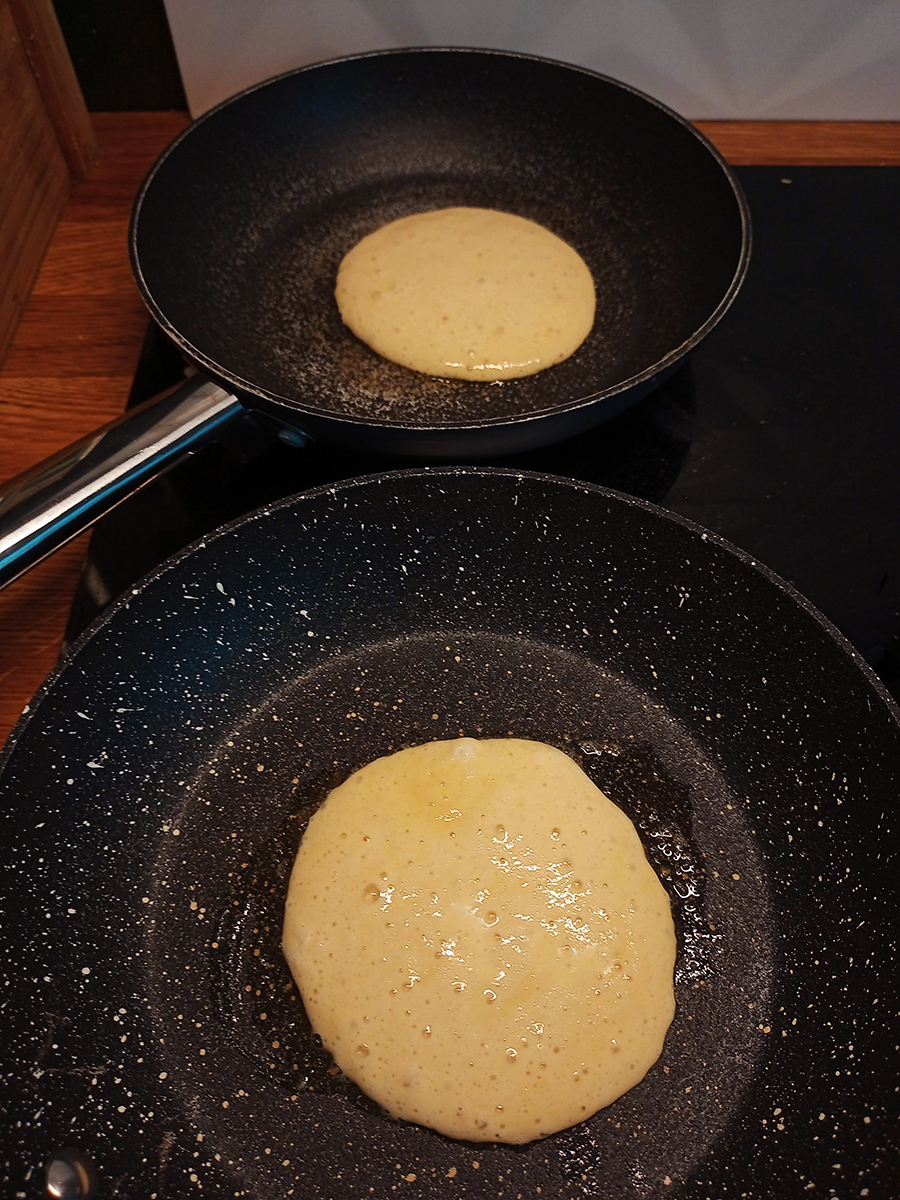 • Put a small knob of butter into two small frying pans (using two pans just makes it faster). Melt over a medium heat then use a brush to spread the butter evenly the size of a pancake.