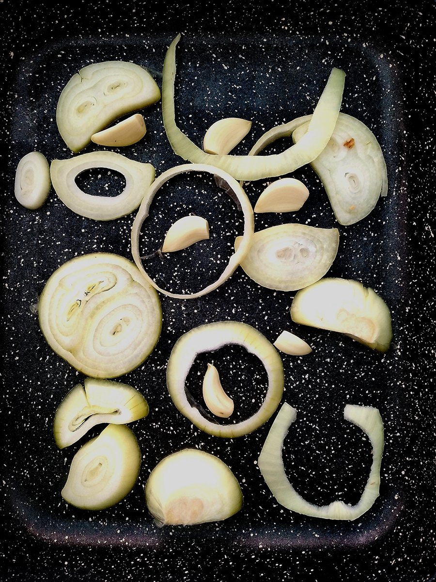 - Pre-heat the oven to 220°c (200°c Fan). Peel and slice the onion and peel the garlic cloves from the skin. Place the onions and garlic in a large roasting tin.
