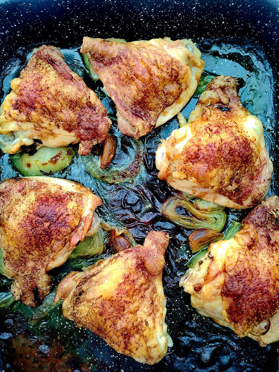 - Dry the chicken thighs with kitchen roll then place on top of the onion slices and garlic. Stretch the skin out so that it’s flat, this will make it crisp up better and sprinkle with salt. There’s no need to add oil as the skin is very fatty. Place the tray in the oven and roast for 45 minutes.