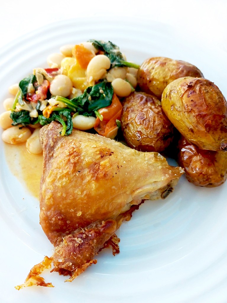 When I roast a chicken there is always a lot of bargaining over who get the crispiest bits of skin. Occasionally I roast a tray of chicken thighs so that everyone gets tender chicken and crispy skin and serve it with Beetroot and Bulgur Wheat Salad or Butter Beans.