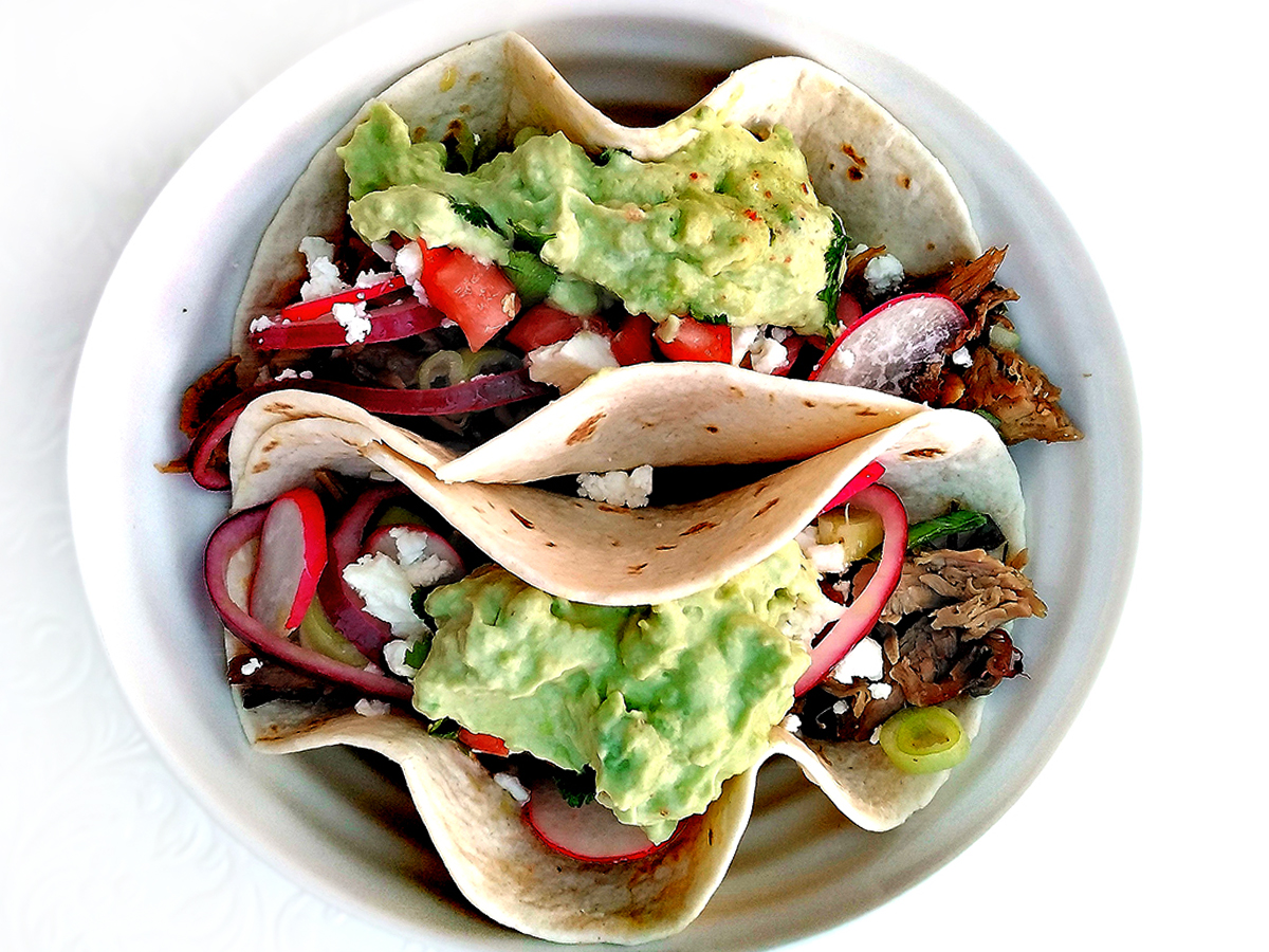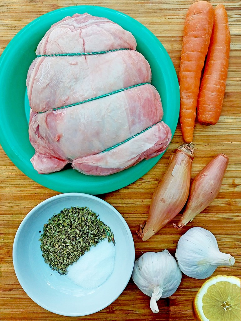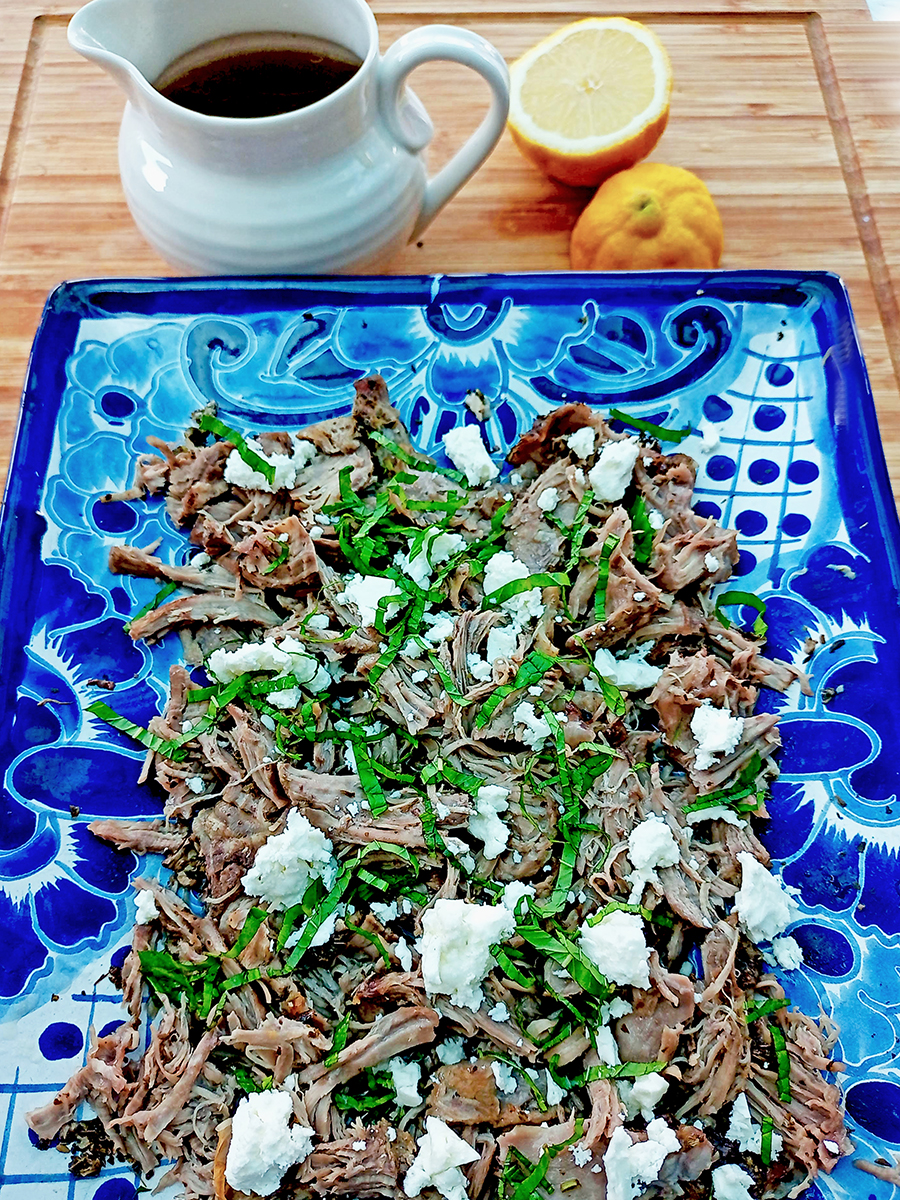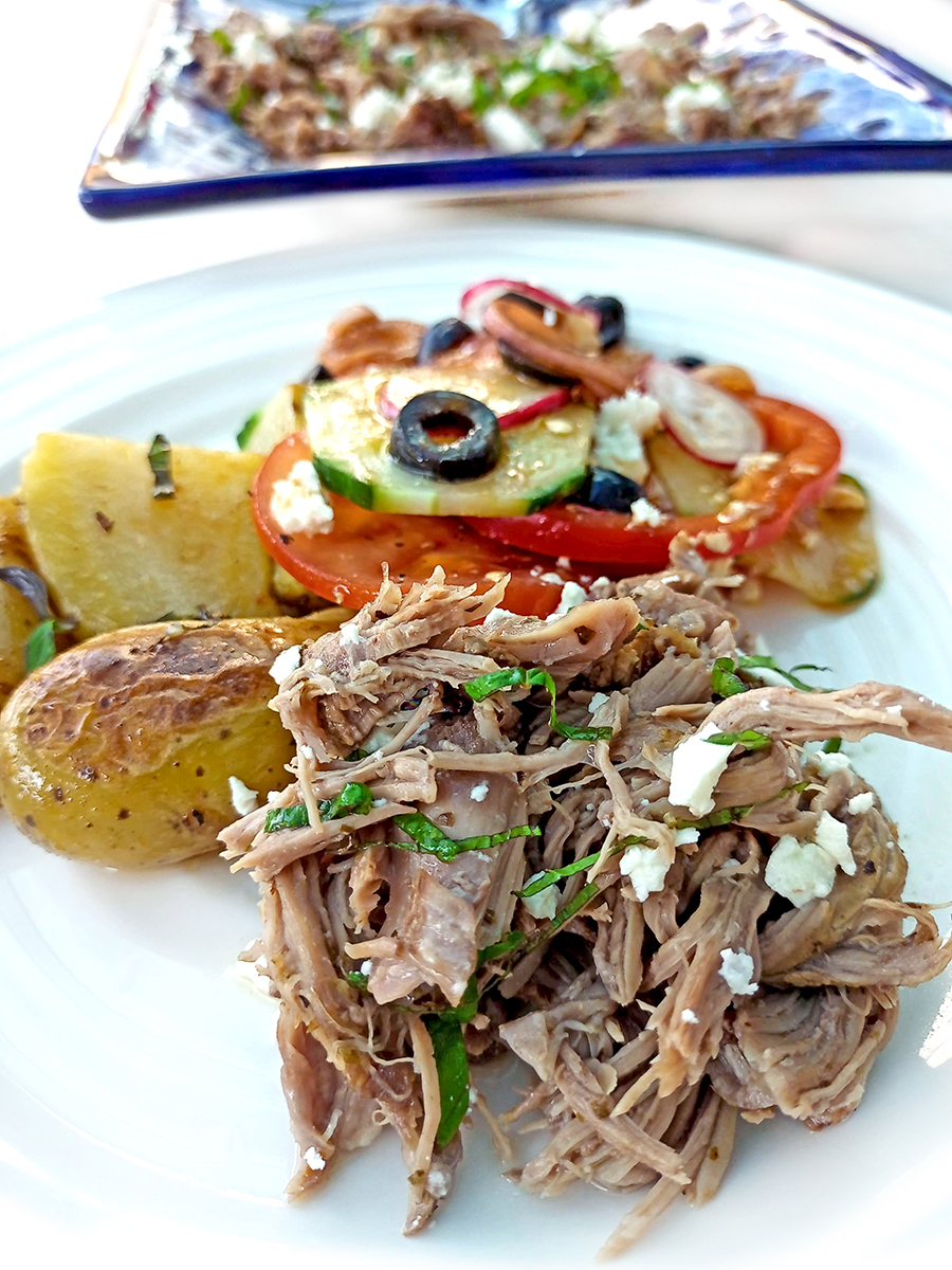 Greece has a beautiful palette of flavours to choose from thanks to the sunshine and coastline. The simple triumvirate of oregano, garlic and lemon are all that’s needed for this delicate meat. I shred the meat to be used in wraps or served with minted potatoes and Flat Salad scattered with olives. The juices that collect during the roasting make the most wonderful gravy so if you want to use this as a traditional Sunday roast, you’re in for a treat.