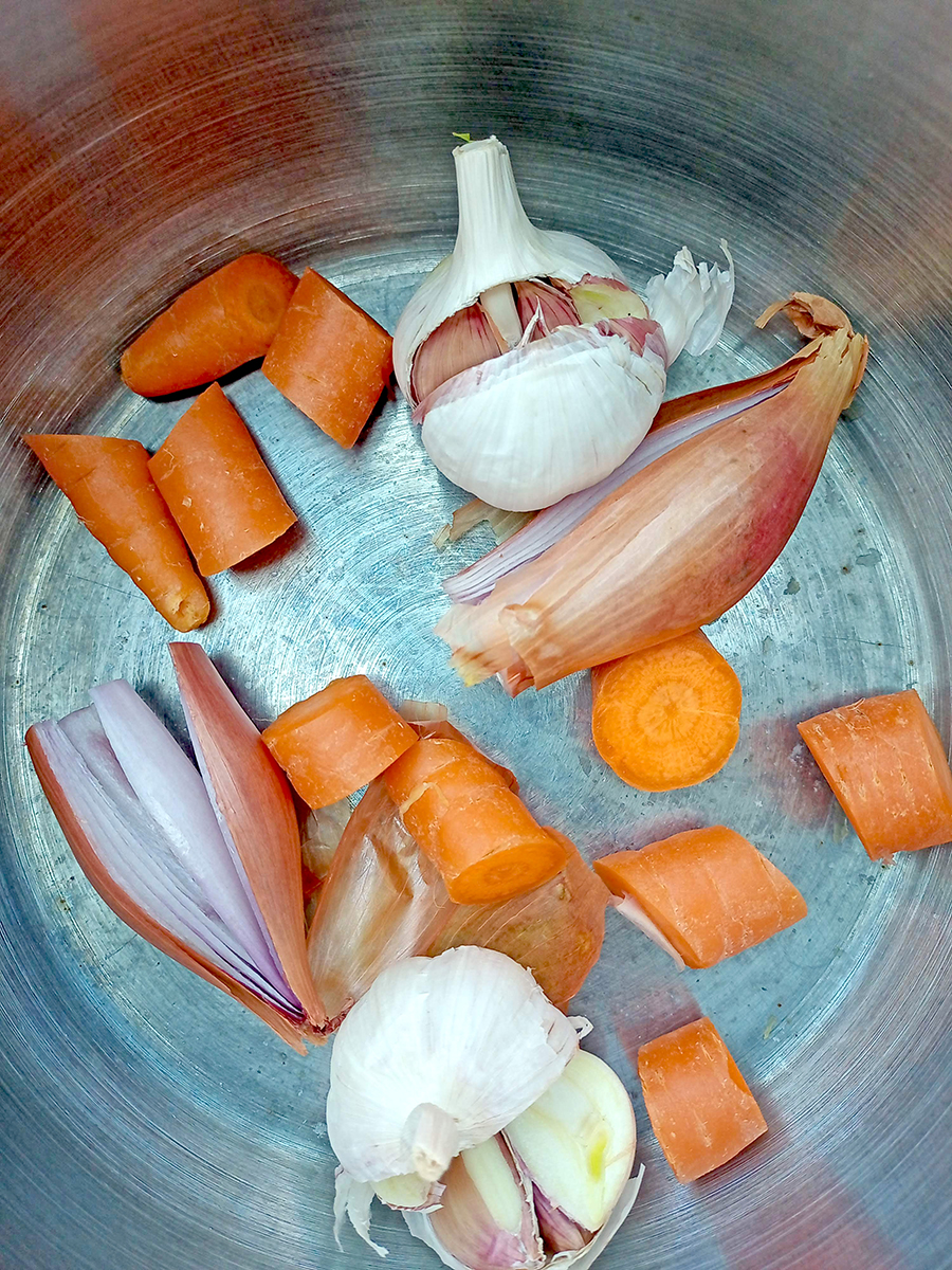 - Pre-heat the oven to 190°C (170°C Fan) and place a shelf on the lower-middle position. Cut the shallots and garlic bulbs in half and roughly chop the carrots then place in a large pan or Dutch oven that has a lid.