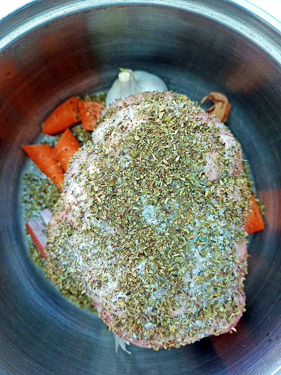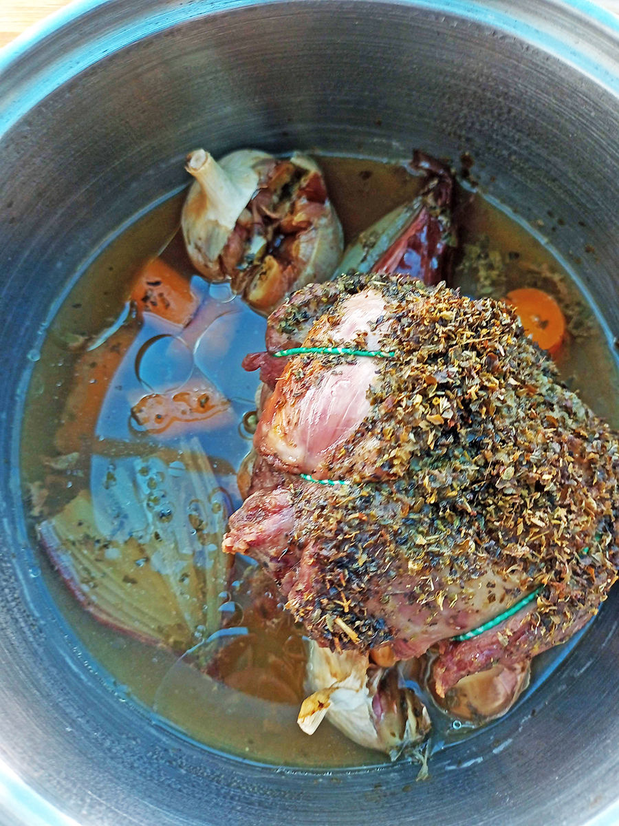 - Rub the lamb all over with the oregano and salt and place on top of the vegetables. Pour in the water then put the lid on and place the pan in the oven for 2-2.5 hours depending on the weight of your lamb (less weight, less time).