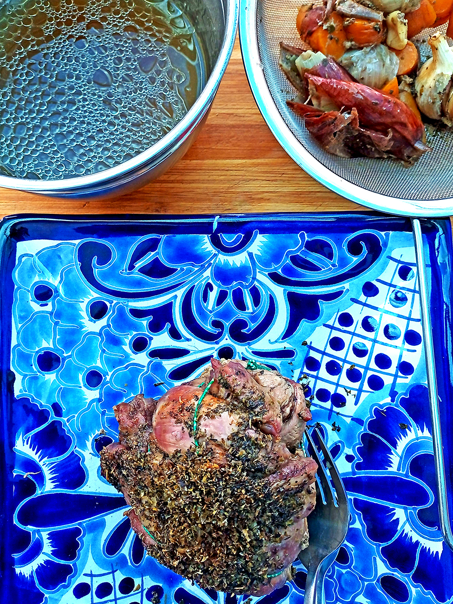 - Remove the lamb and garlic bulbs and place on a plate. Drain off the liquid through a sieve into a jug then discard the vegetables. Squeeze the garlic from the clove skins and mash with a fork then either add them to the lamb or the stock.