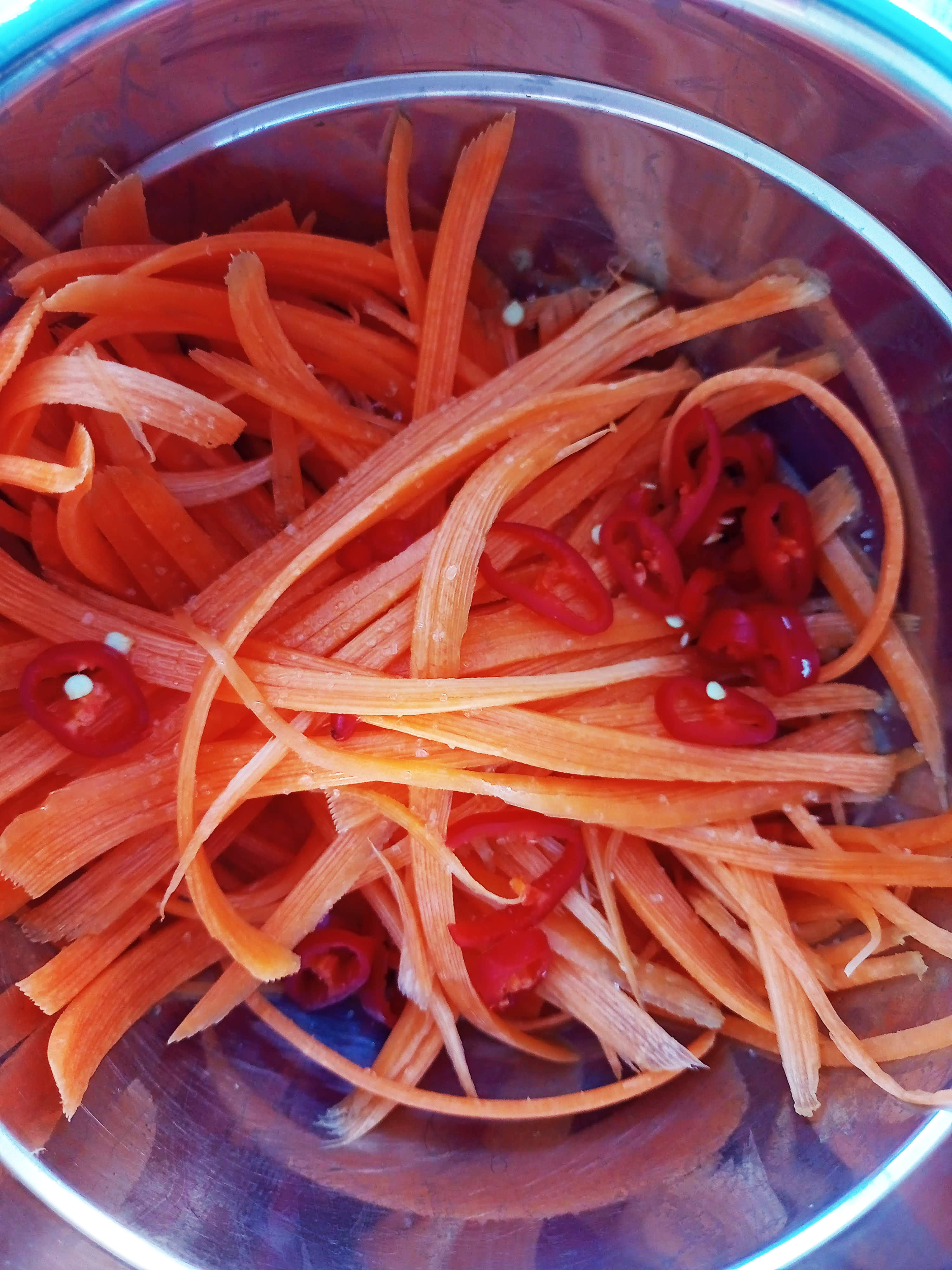 - Put all the julienned carrots in a mixing bowl then finely chop the chilli and add to the bowl.