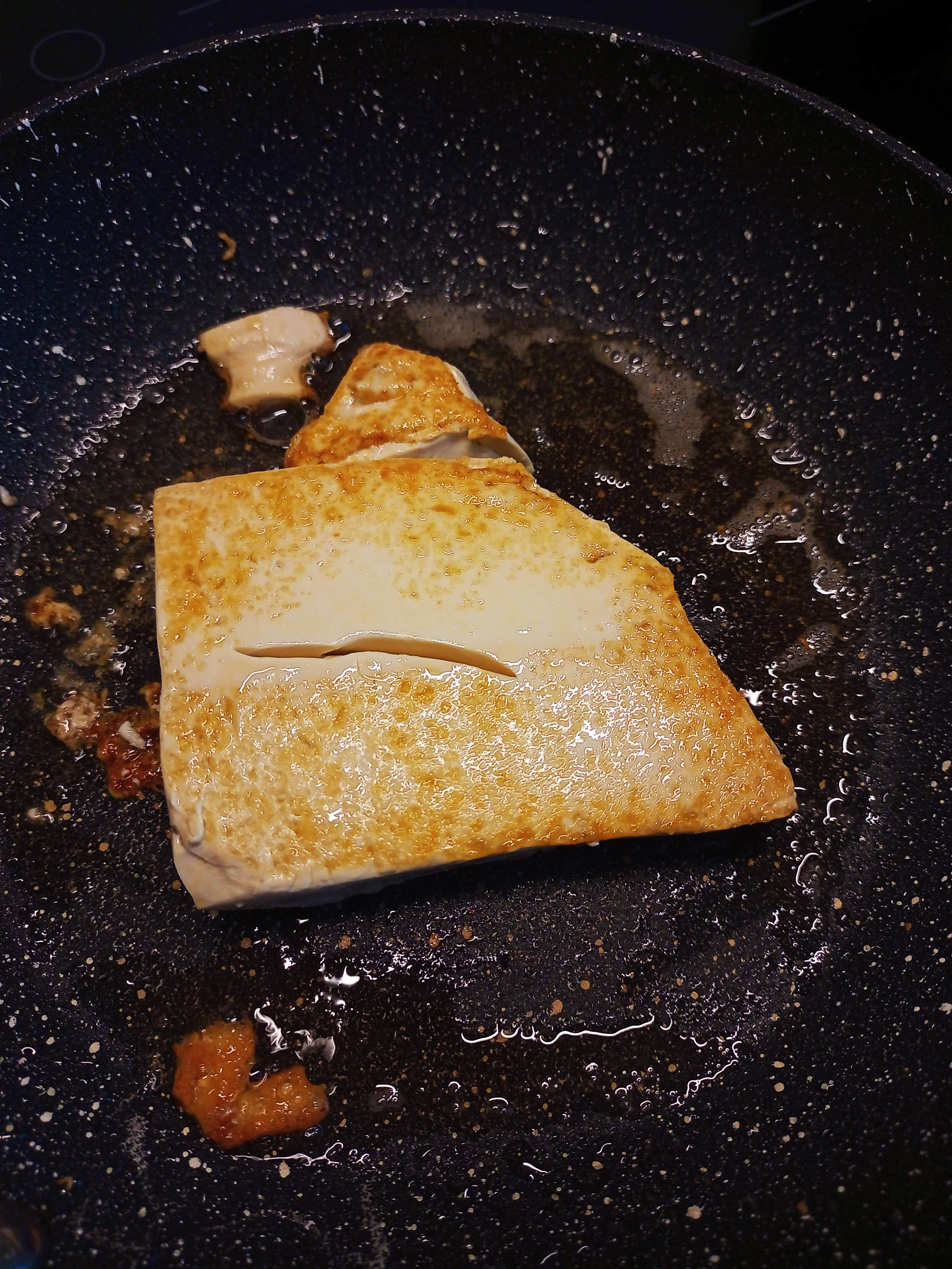 - Put 1 tablespoon of sesame oil into a large frying pan over a medium high heat. Put the whole block of tofu into the oil and cook for a few minutes until a caramelized skin forms then turn over. Don’t worry if pieces fall off because once the tofu is fried on both sides slice the tofu into bite-sized pieces.