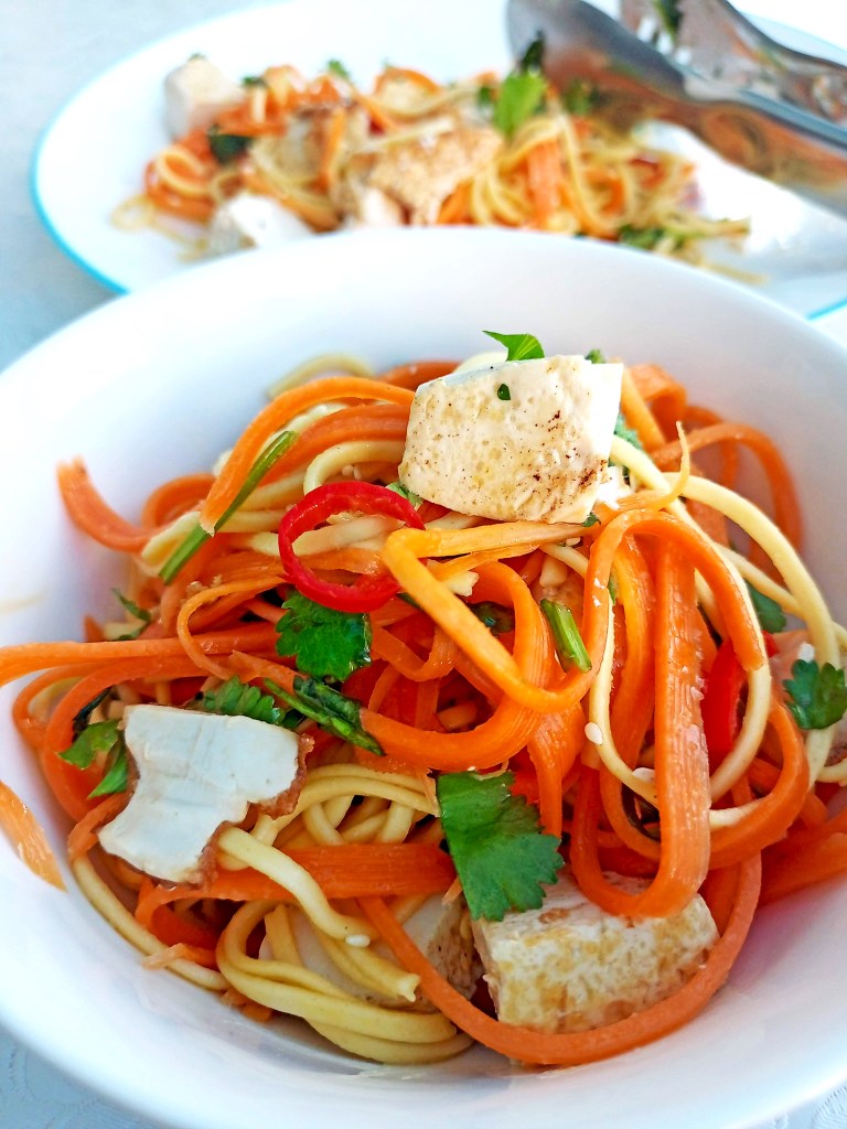 - Cook the noodles in boiling water until tender (a couple of minutes). With a slotted spoon remove the tofu from the pan and place in a small bowl then drain the noodles and place in the frying pan. Add another tablespoon of sesame oil and toss to coat the noodles.