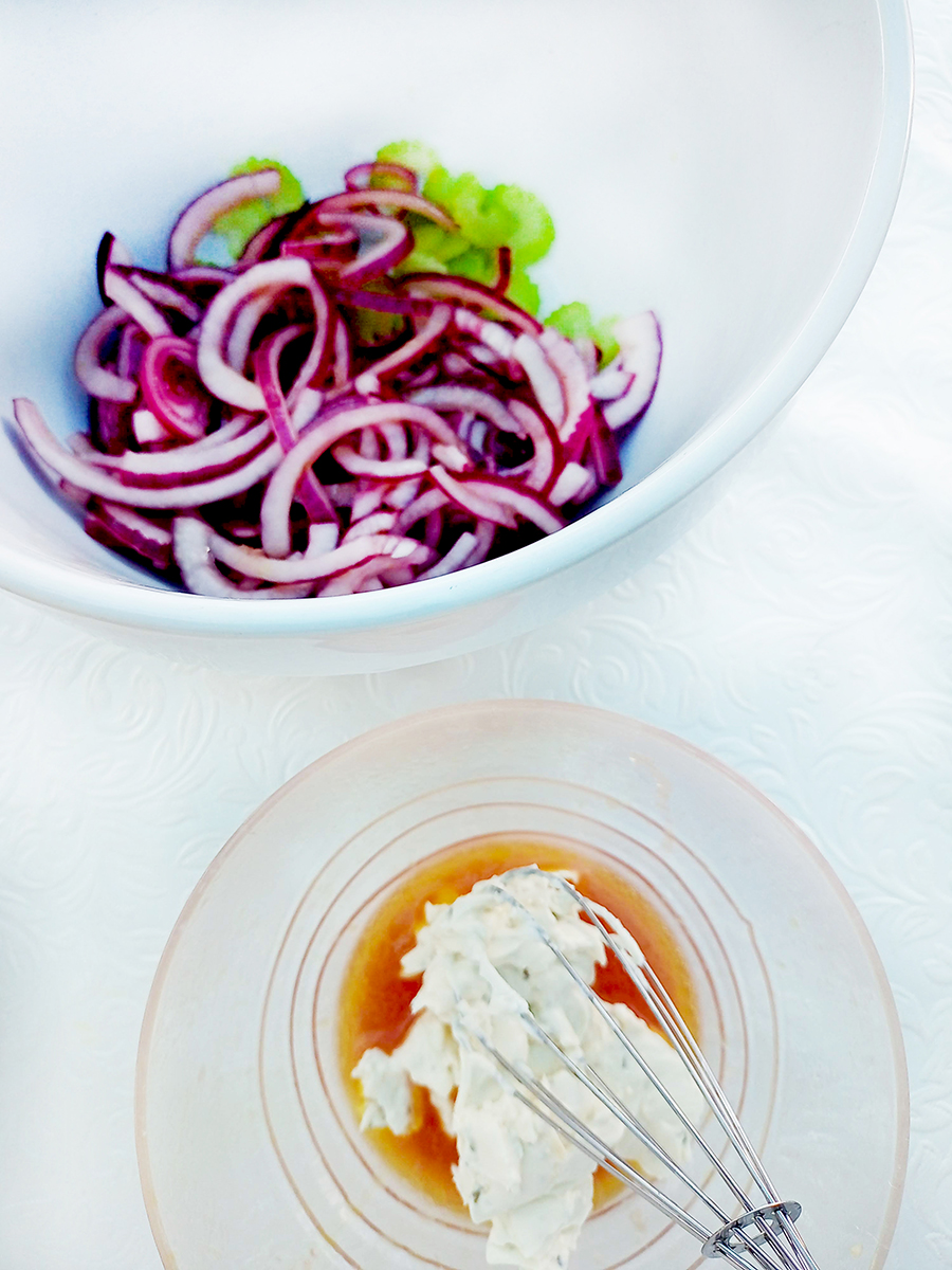 - Tip the mixture over the potatoes then add the onion and celery and stir everything together.