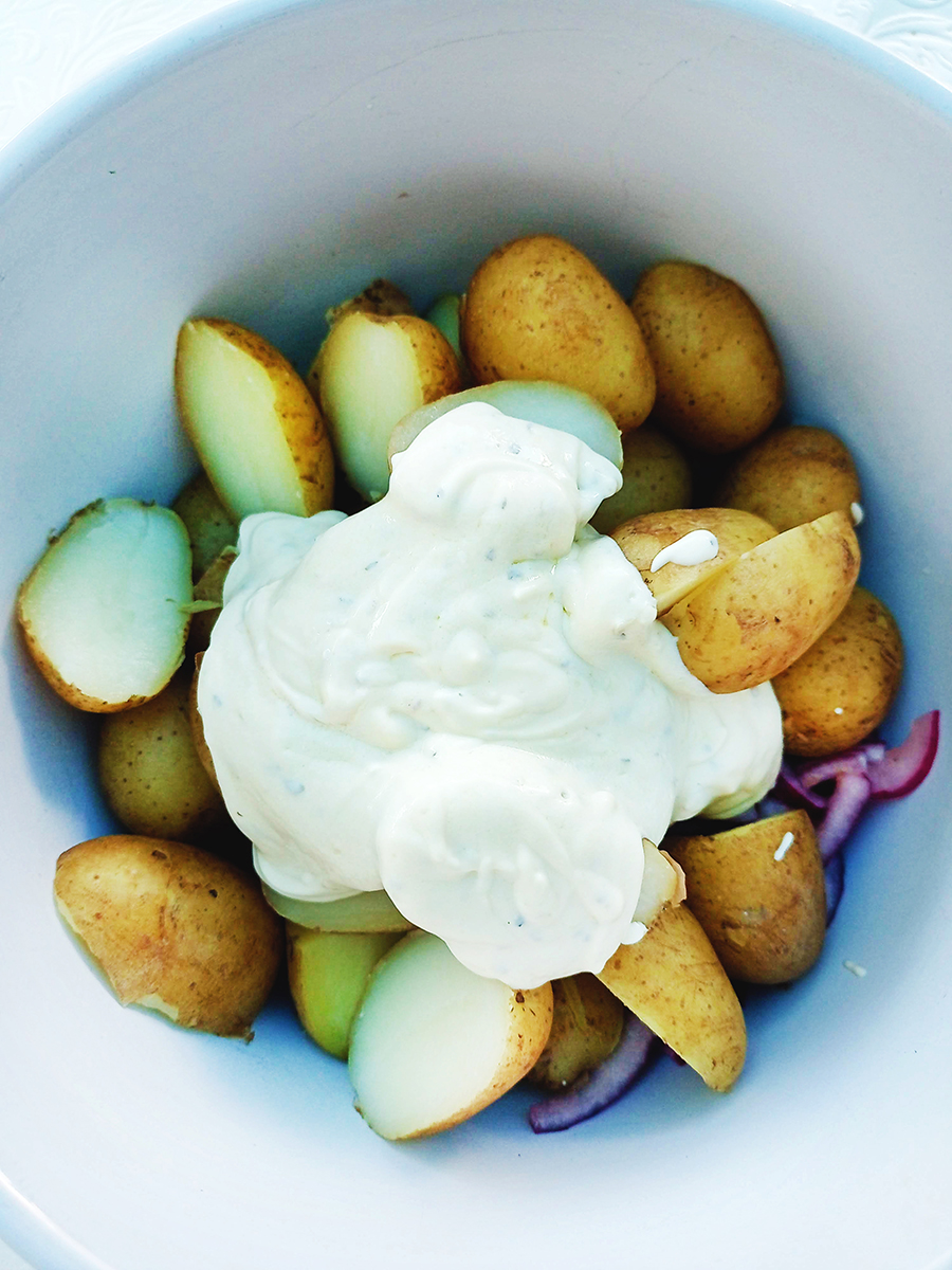 - Cut the potatoes to be roughly the same size (leave the smallest ones whole and cut the larger ones in half) then place in cold, salted water in a large pan.