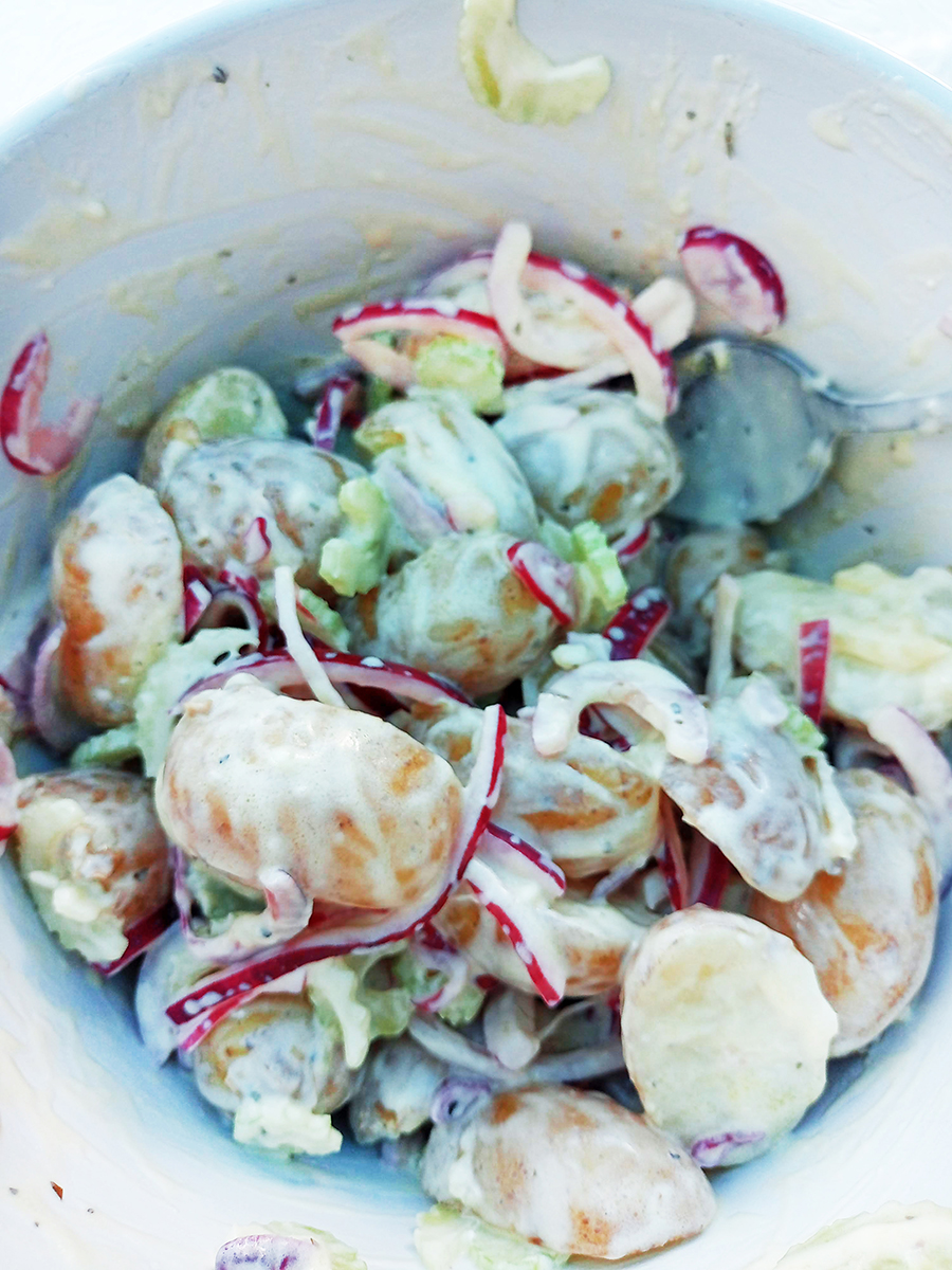 We had a really good potato haul this year. One variety as big as jacket spuds and another small like new potatoes. After pulling them out of the ground I cleaned off the excess dirt with a clean, dry cloth then I have them stored in a clean pillow case in the pantry. I’ve used lots of small spuds to make this Potato and Egg Salad because it’s a meal on its own. Even as autumn edges out the last throes of summer I’m still making this generous salad for family lunch at the weekends.