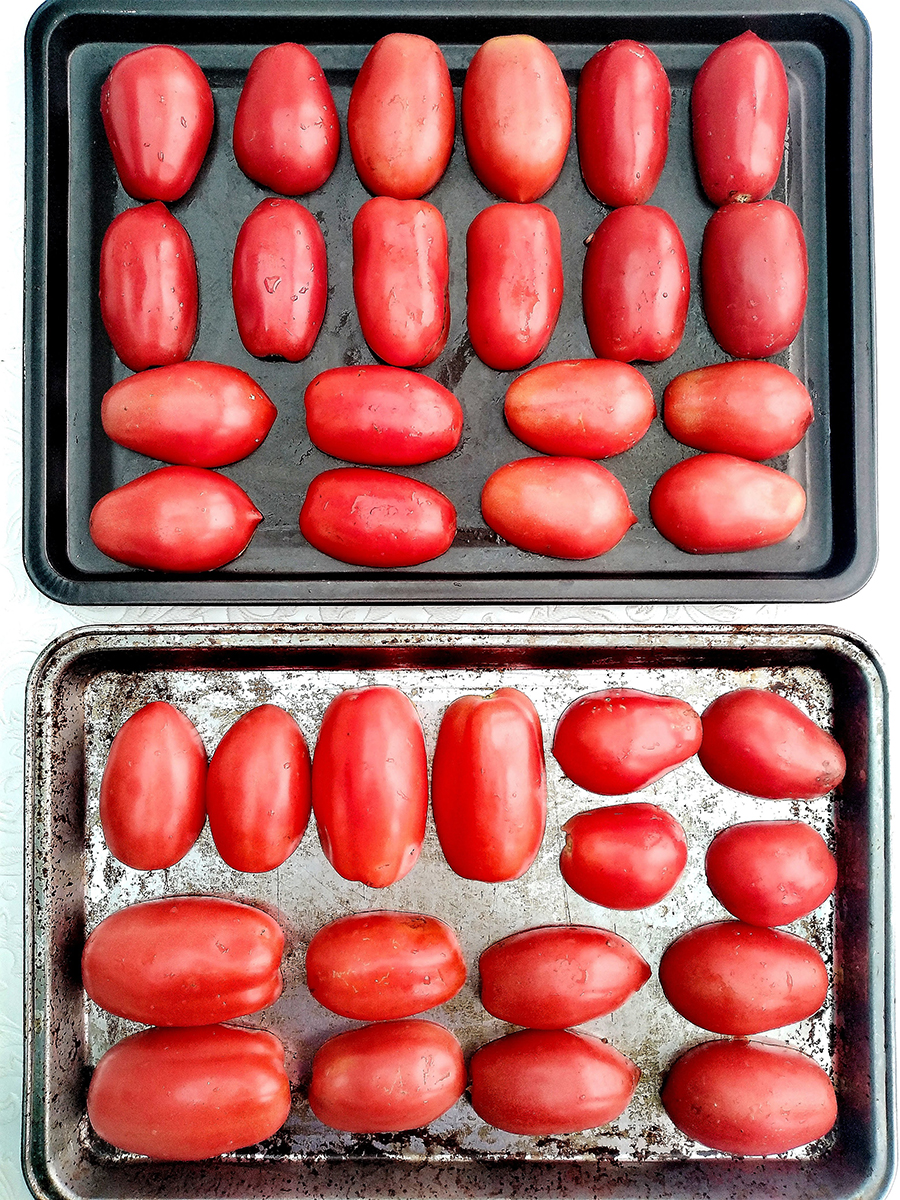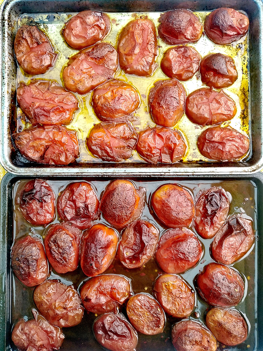 - Preheat the oven to 220°C (200°C fan). Wash the tomatoes and remove the stalks. Cut the tomatoes lengthways and place cut side down on a baking sheet. Put the oil, vinegar, sugar, oregano, salt and pepper (and chilli flakes if using) in a bowl and whisk together. Pour over the tomatoes then into the oven for 40 minutes.