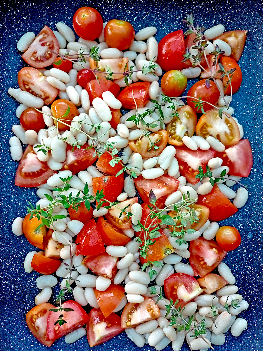 - Pre-heat the oven to 220°C (200°C fan). Cut the tomatoes into similar sizes, leaving the smallest ones whole. Drain the cannellini beans then tip into a large baking dish along with the tomatoes and scatter over the thyme. Grind over generously with salt and pour over the balsamic.