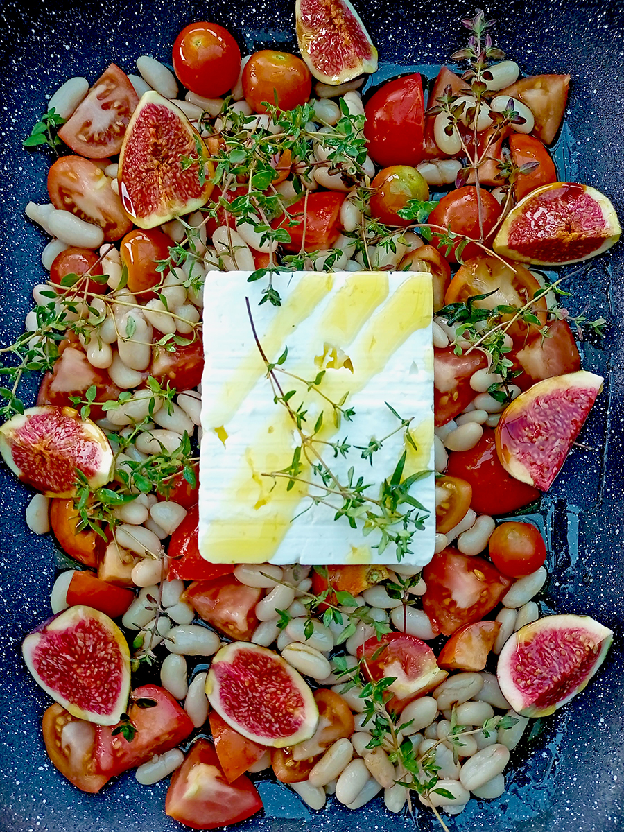 - Place the feta in the centre of the veggies. Quarter the figs and place around the feta. Drizzle olive oil over the whole dish then add more thyme on top of the feta.