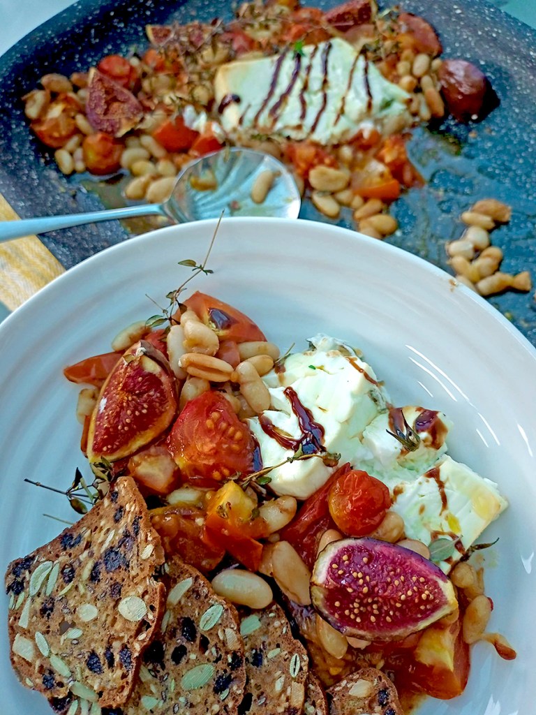 There are some recipes that beautifully bridge summer and autumn and this is one of my favourites. We eat this dish by spooning the mixture onto hard, fruity crackers (I love these Miller’s Toast Crackers) or warm, crusty bread. It’s basically warm cheese and crackers but the sweet, roasted veggies and beans make it into a meal.
