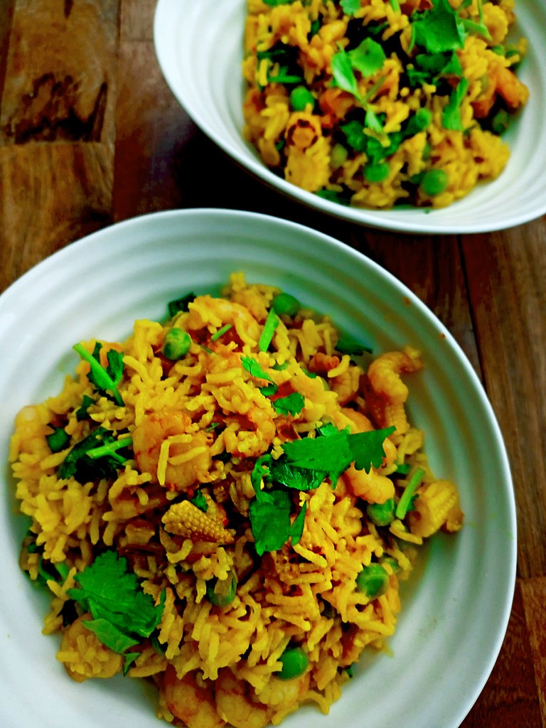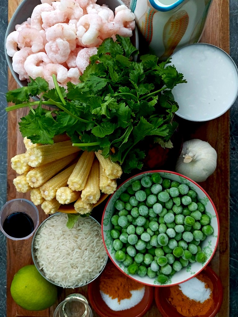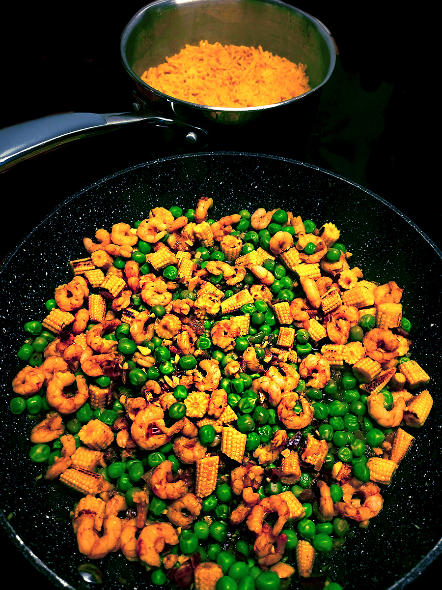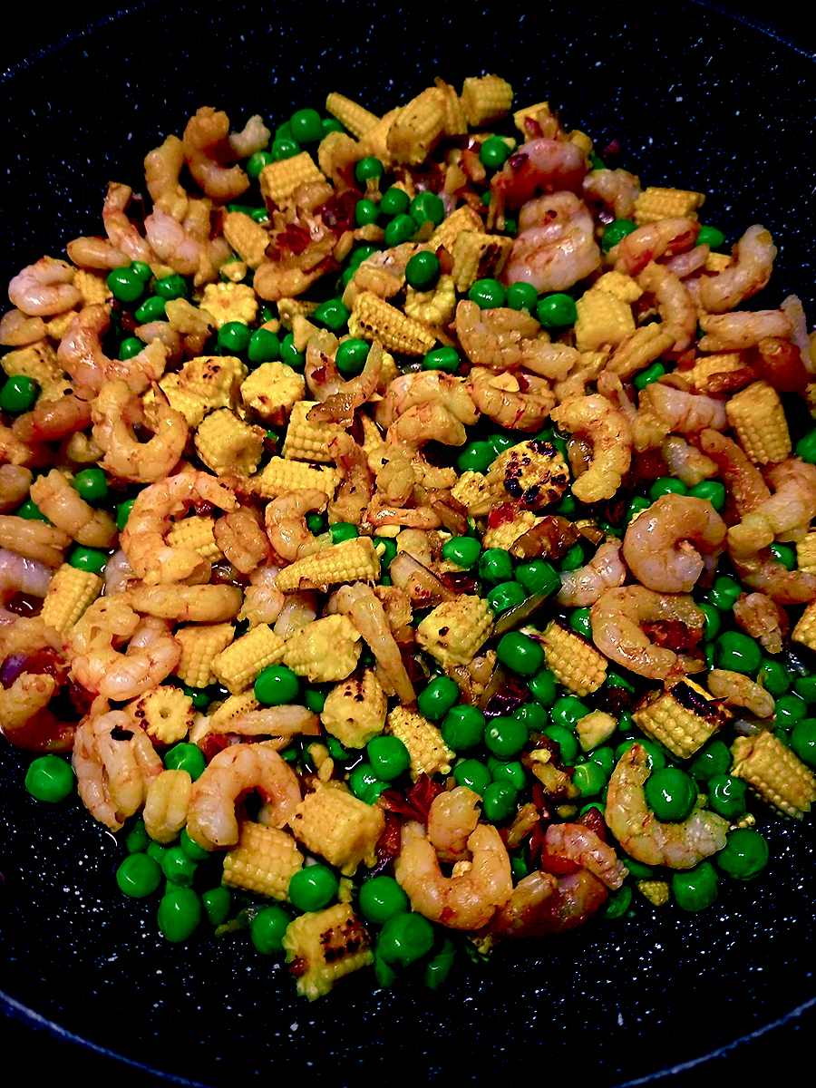 - Put a little veg oil in a large frying pan on a medium high heat and brown the chopped baby corn then add the frozen prawns. Add the prawns and all the liquid and cook until the peas and prawns are cooked then add the rice and stir through to combine. Roughly chop some coriander to finish.