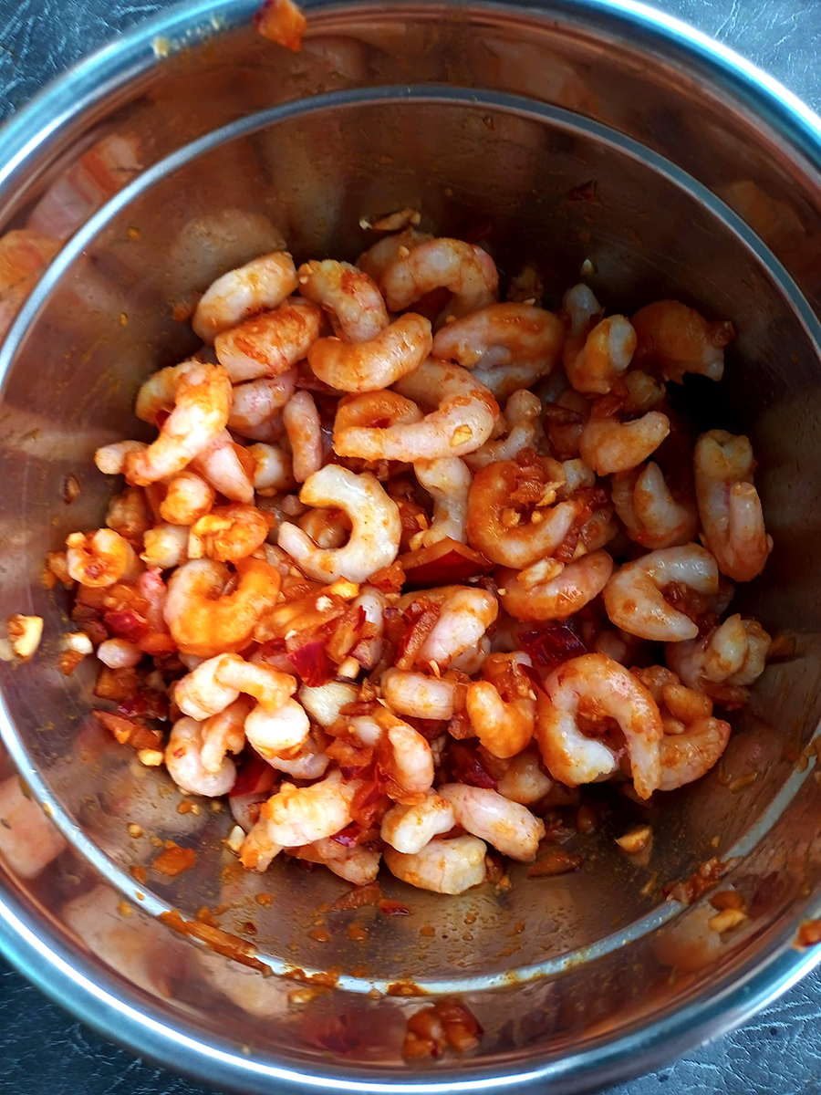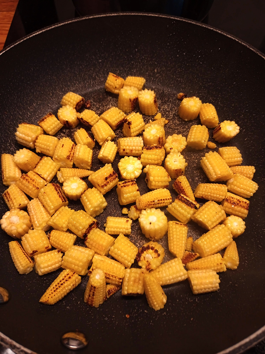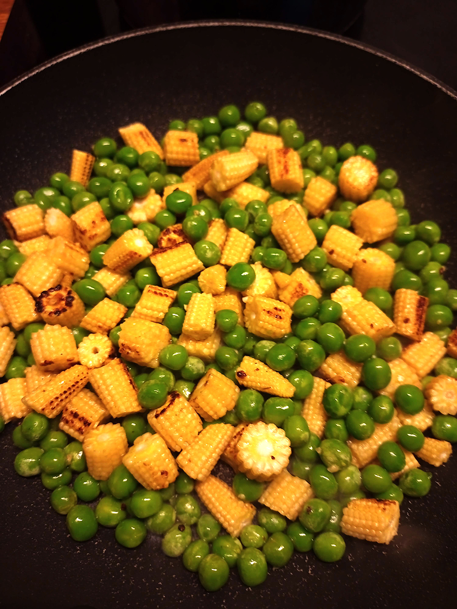 - Put a little veg oil in a large frying pan on a medium high heat and brown the chopped baby corn then add the frozen prawns. Add the prawns and all the liquid and cook until the peas and prawns are cooked then add the rice and stir through to combine. Roughly chop some coriander to finish.