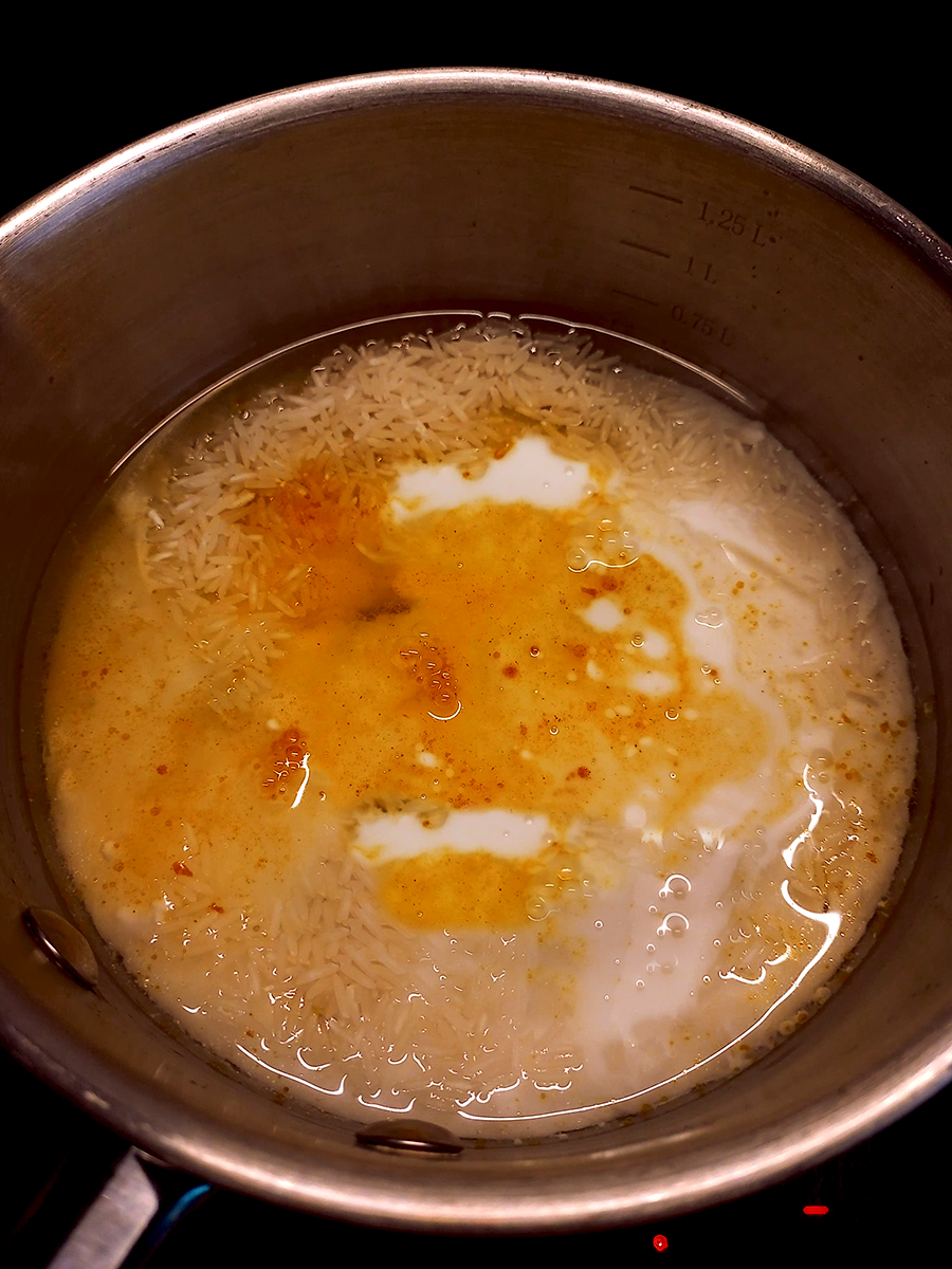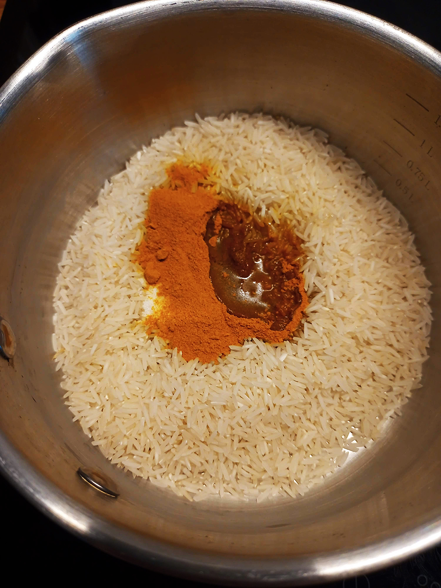 - Tip the rice, 1 tsp turmeric, salt, veg oil water and coconut milk into a small saucepan and stir. Bring to the boil then immediately turn the heat down to medium low, put a lid on and cook for 20 minutes then fluff with a fork.