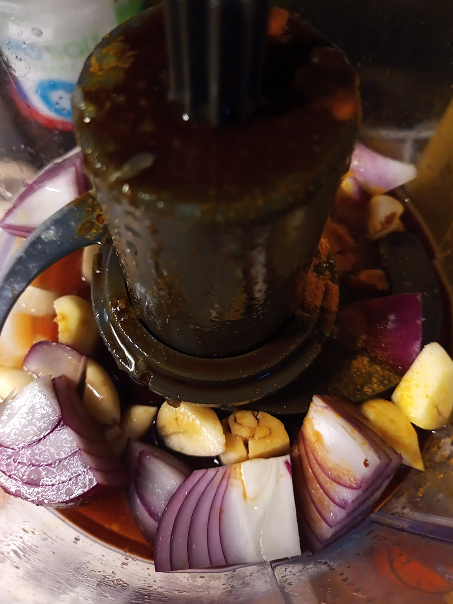 - Peel the onion and garlic and place in a food processor along with the juice of a lime, the soy sauce, 1 tsp turmeric and the sugar. Whiz until you have a paste. Stir the paste into the frozen prawns and allow to marinate for 10 minutes.