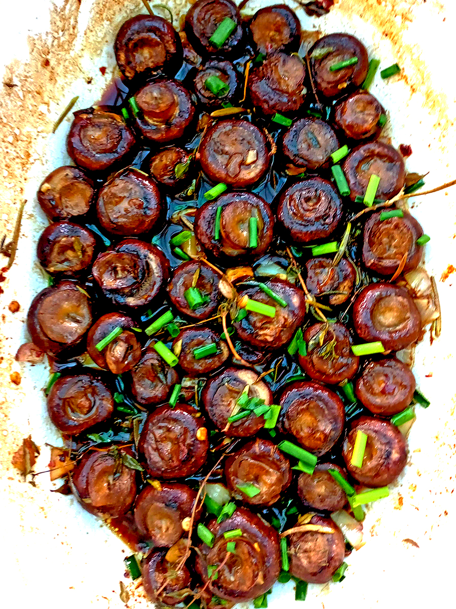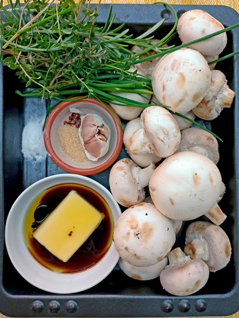 - Put the cleaned mushrooms into a roasting tray or dish (not too big or the liquid will evaporate) then pour over the flavoured butter and toss to coat the mushrooms. Put the tray on a high shelf in the oven for 20 minutes, turning after 15 minutes. Serve and scatter with chopped chives.
