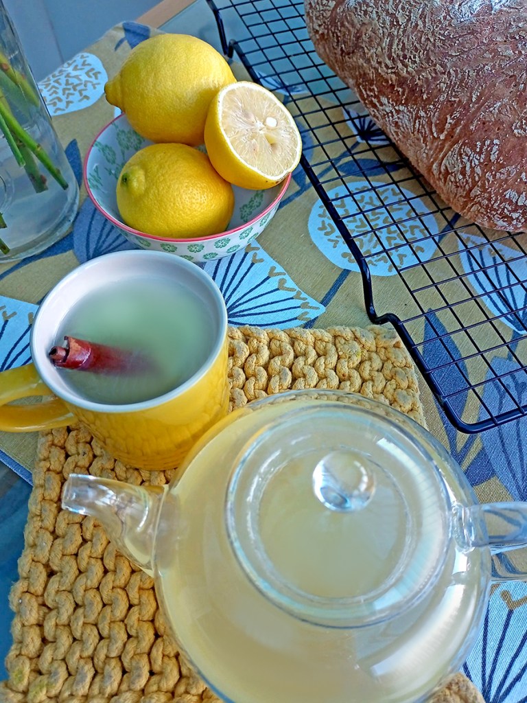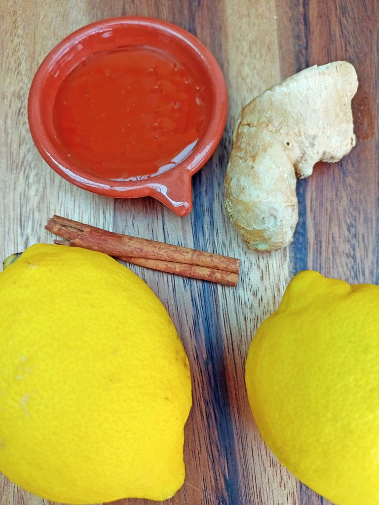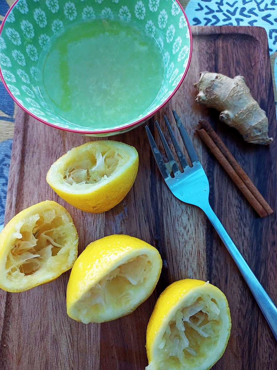 - Put the lemon shells, ginger, cinnamon and water into a small pan. Bring the water to a boil then immediately reduce the heat to a simmer for 10 minutes.