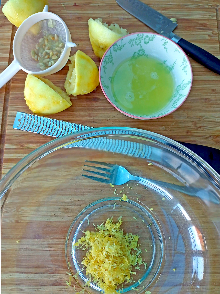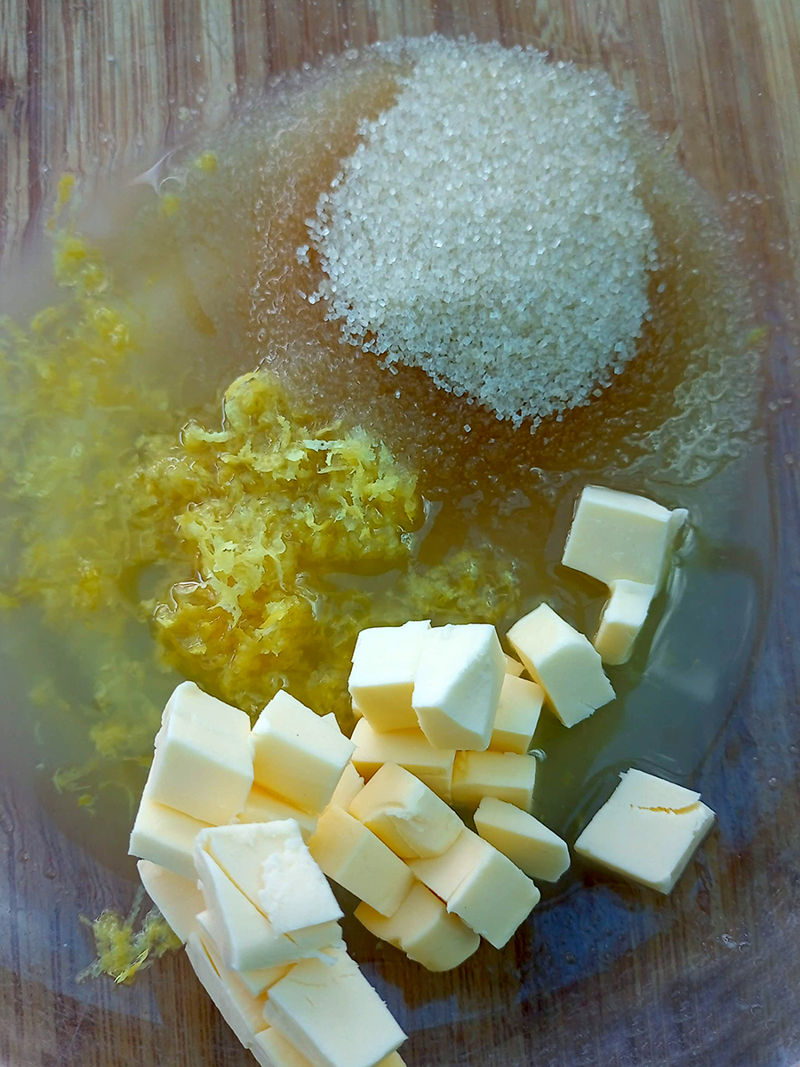 - Zest the lemons and juice them through a small sieve to remove the pips. Cut the butter into small cubes. Tip the sugar, butter, lemon just and zest into a glass bowl.