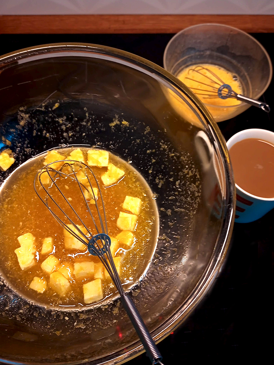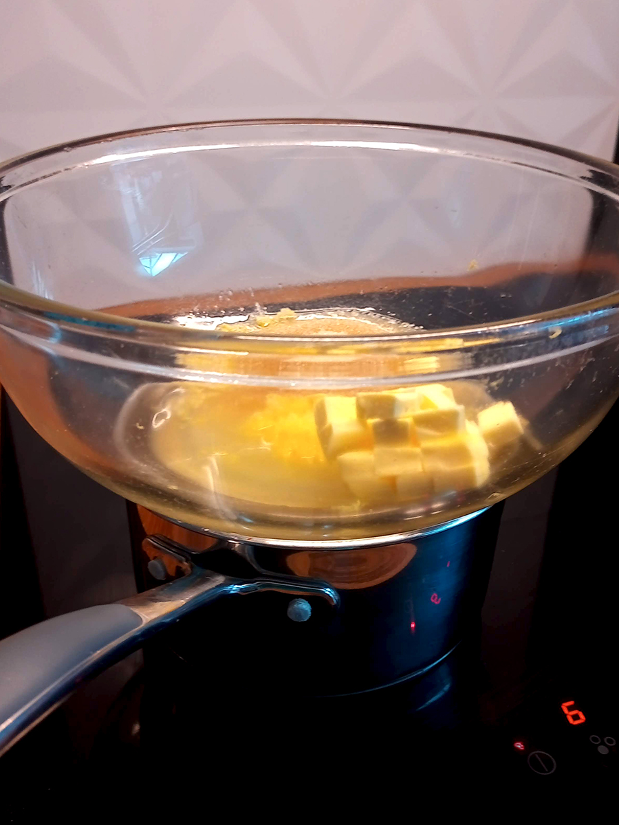 - Fill a small saucepan 1/3 with water then place the glass bowl on top. Bring the water to a gentle simmer (no bouncing bubbles) and gently whisk until the butter melts.