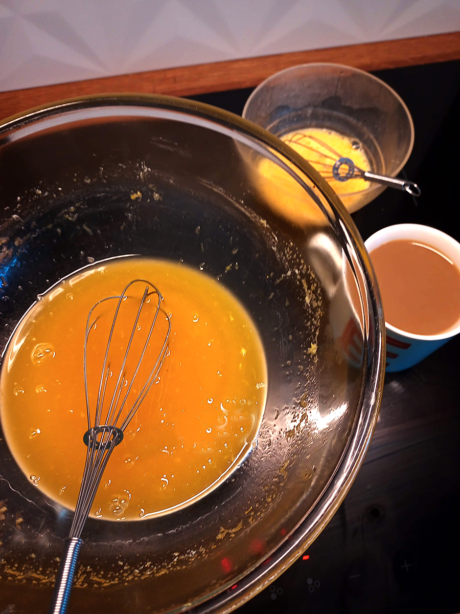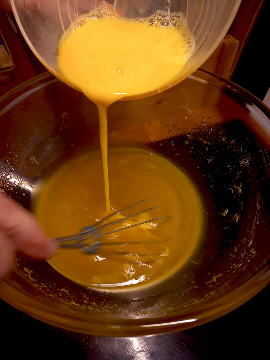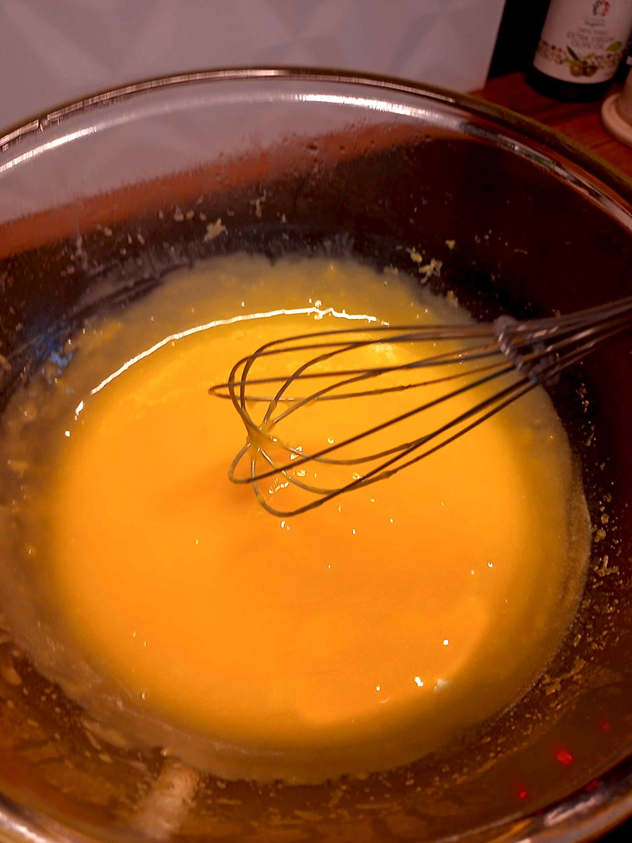- Thoroughly whisk the 2 medium eggs and egg yolk together until there is no trace of white left.